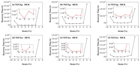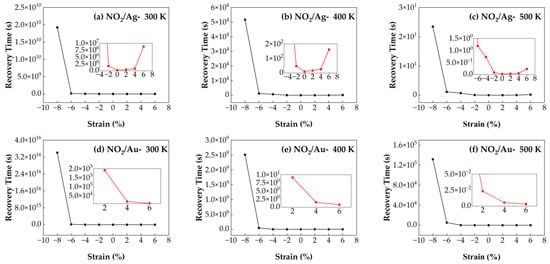 Recovery times of NO adsorption on Ag- and Au-doped SnSe2 monolayers under biaxial strains ranging from −8% to 6% at different temperatures: (a–c) Ag-doped SnSe2 at (a) 300 K, (b) 400 K, and (c) 500 K; (d–f) Au-doped SnSe2 at (d) 300 K, (e) 400 K, and (f) 500 K.