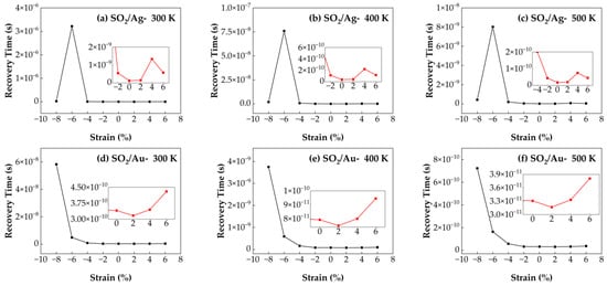 Recovery times of SO2 adsorption on Ag- and Au-doped SnSe2 monolayers under biaxial strains ranging from −8% to 6% at different temperatures: (a–c) Ag-doped SnSe2 at (a) 300 K, (b) 400 K, and (c) 500 K; (d–f) Au-doped SnSe2 at (d) 300 K, (e) 400 K, and (f) 500 K.