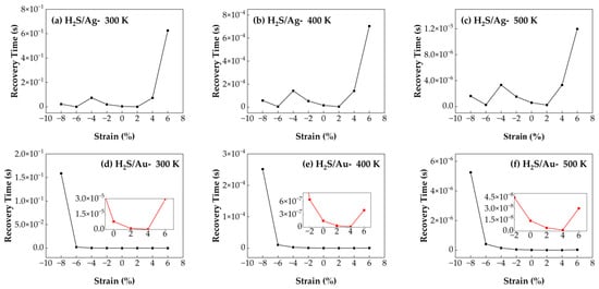 Recovery times of H2S adsorption on Ag- and Au-doped SnSe2 monolayers under biaxial strains ranging from −8% to 6% at different temperatures: (a–c) Ag-doped SnSe2 at (a) 300 K, (b) 400 K, and (c) 500 K; (d–f) Au-doped SnSe2 at (d) 300 K, (e) 400 K, and (f) 500 K.