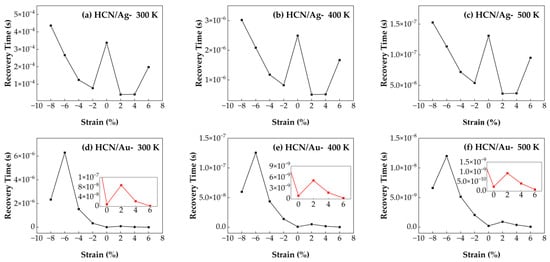 Recovery times of HCN adsorption on Ag- and Au-doped SnSe2 monolayers under biaxial strains ranging from −8% to 6% at different temperatures: (a–c) Ag-doped SnSe2 at (a) 300 K, (b) 400 K, and (c) 500 K; (d–f) Au-doped SnSe2 at (d) 300 K, (e) 400 K, and (f) 500 K.