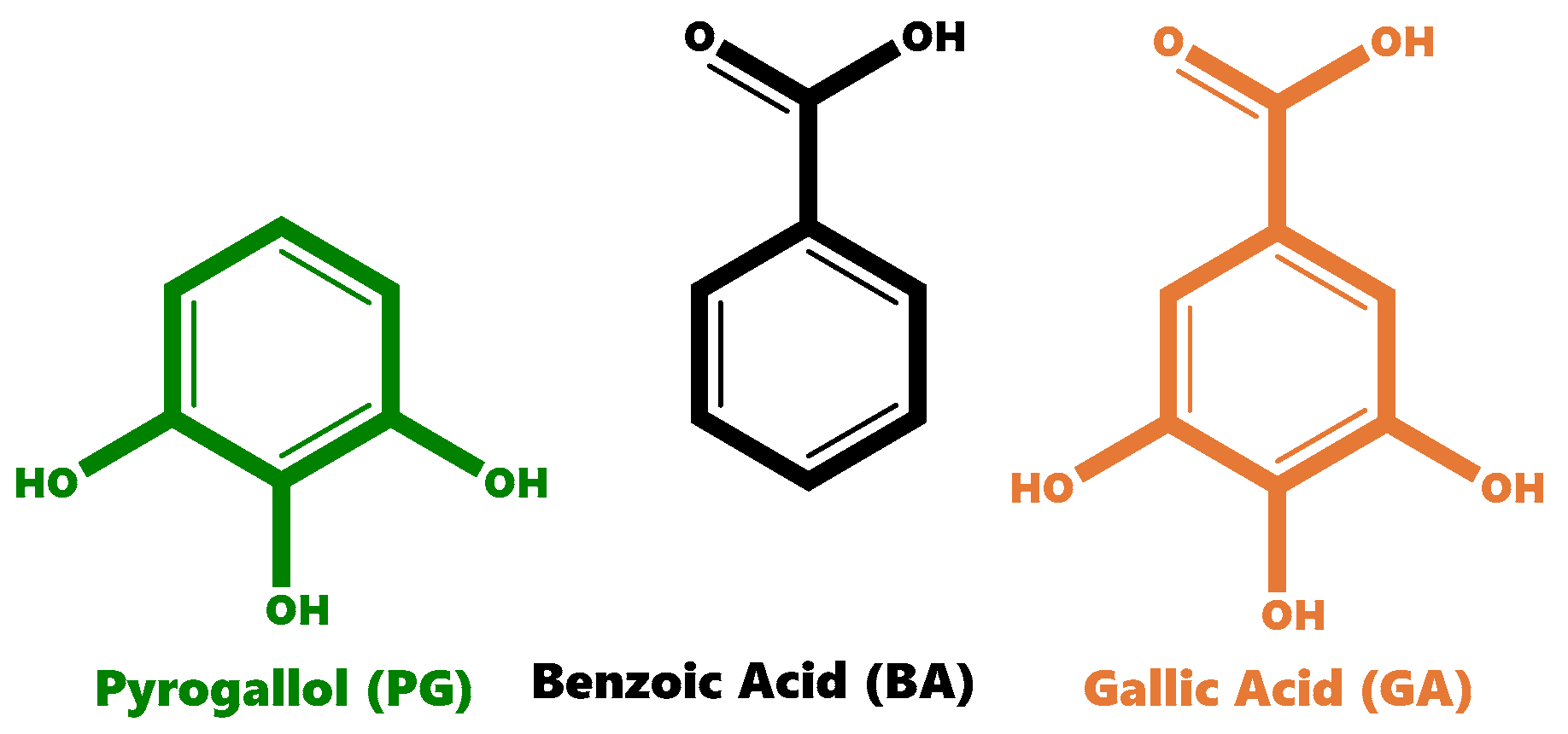 - Selvaraj, S.; Rajkumar, P.; Thirunavukkarasu, K.; Gunasekaran, S.; Kumaresan, S. Vibrational (FT-IR and FT-Raman), electronic (UV–vis) and quantum chemical investigations on pyrogallol: A study on benzenetriol dimers. Vibr. Spectr. 2018, 95, 16–22. [Google Scholar] [CrossRef]
