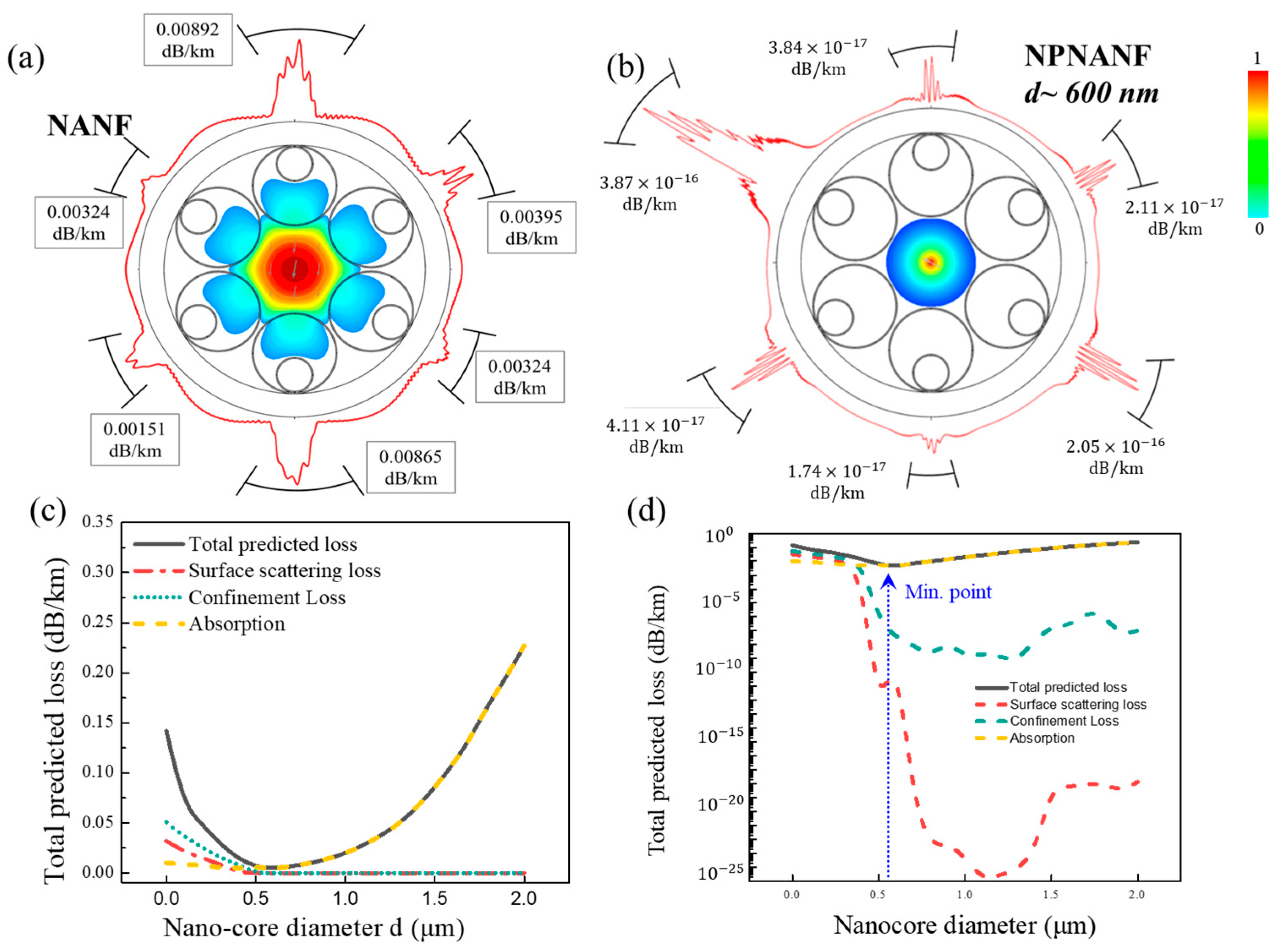 | Fiber Type | Diameter of the Nano-Core d (nm) | Loss (dB/km) | Effective Refractive Index |