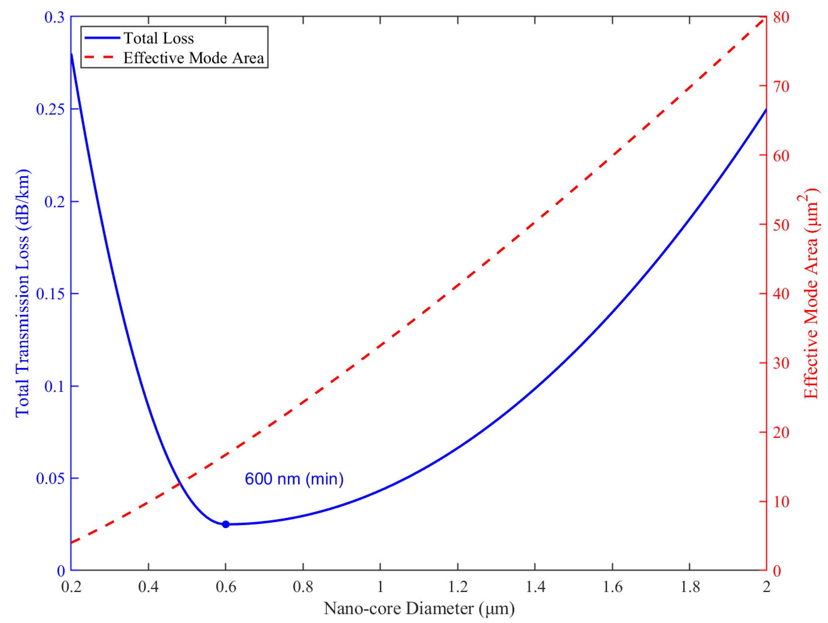 | Core Diameter (nm) | Loss (dB/km) | Effective Index | Mode Area (μm2) | Core Power Ratio (%) | |
