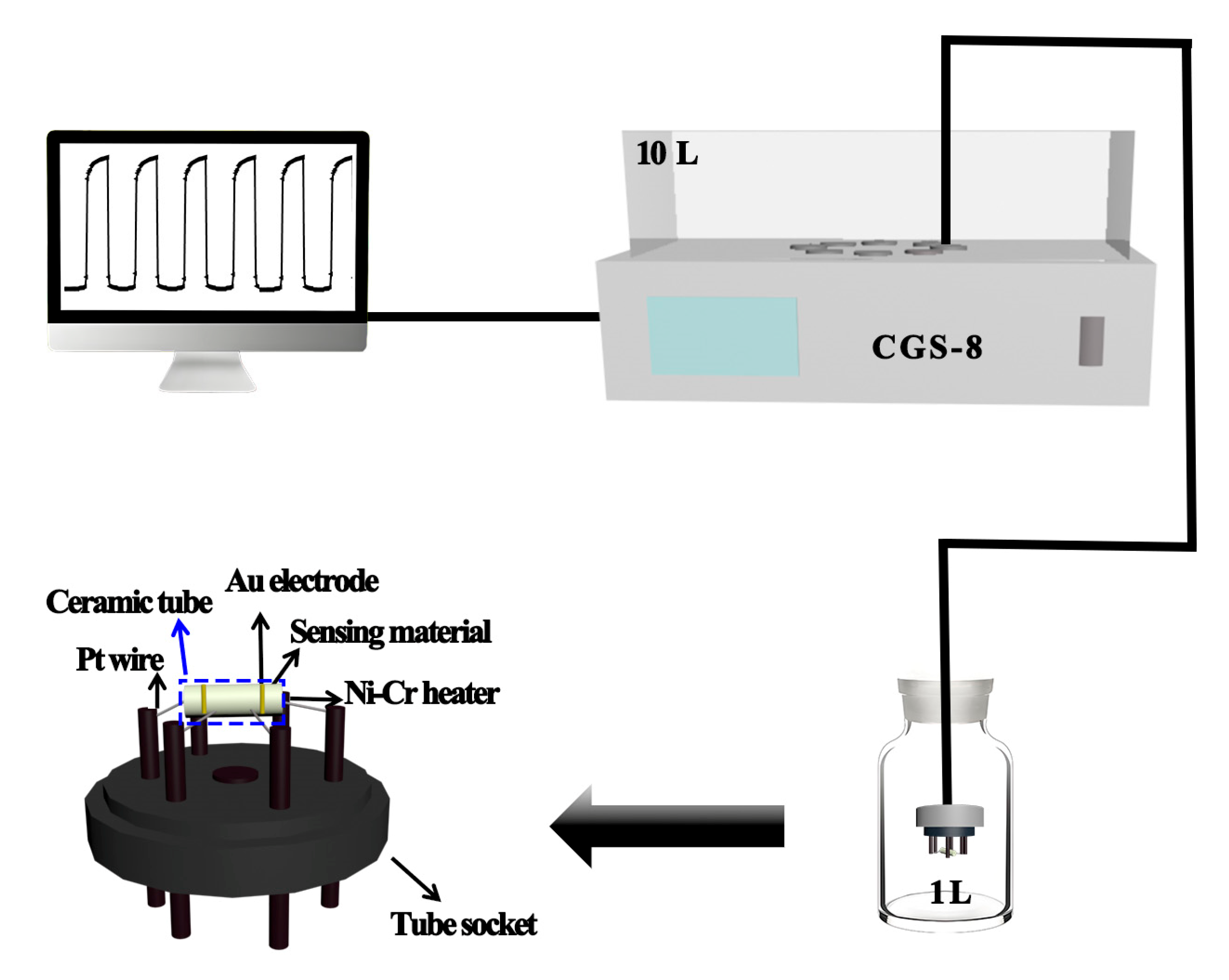 Figure 1. The gas testing system and schematic structure of the hierarchical NiO-SnO2 gas sensor.
