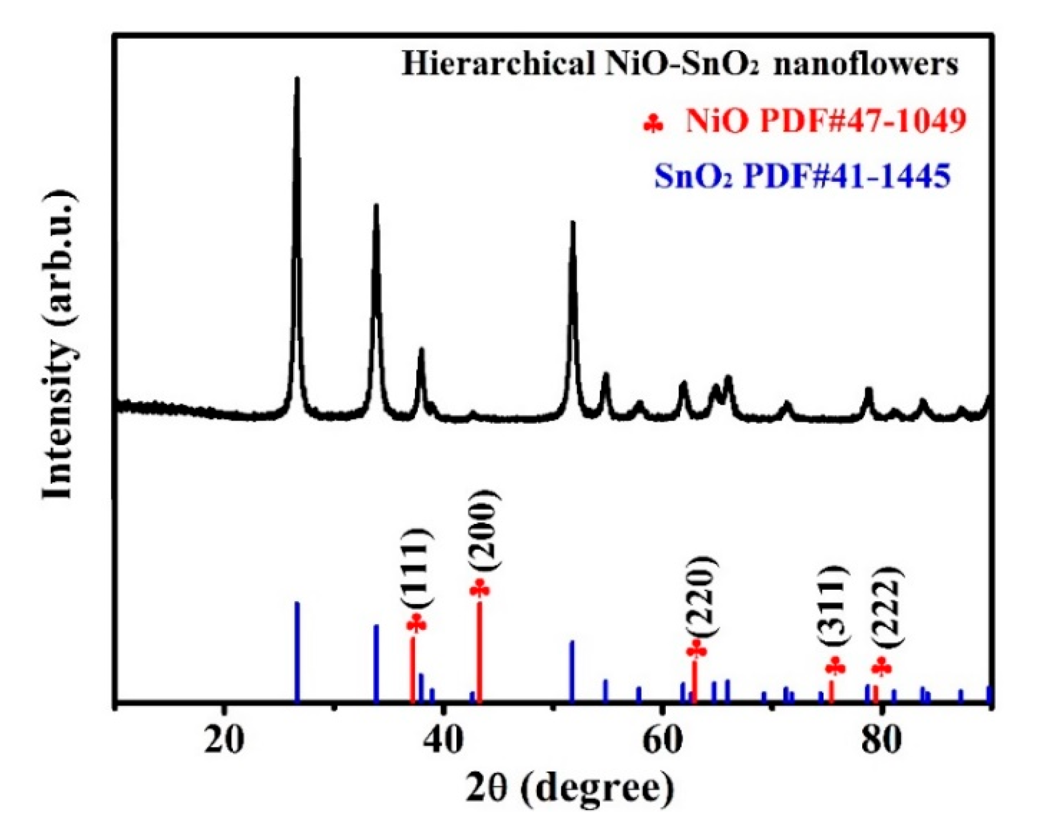 The phase and crystal structure of hierarchical NiO-SnO2 nanoflowers were confirmed by XRD measurement, as shown in Figure 2. From this picture, it can be clearly seen that most of the diffraction peaks can be well assigned to the SnO2 and NiO, which demonstrates that the as-obtained product was made up of SnO2 and NiO. And all diffraction peaks of NiO and SnO2 were in good agreement with the standard SnO2 (JCPDS: No. 41-1445) and NiO (JCPDS: No. 47-1049) card without any other impurity peaks in this composite [56]. Additionally, the diffraction peaks of hierarchical NiO-SnO2 are sharp and strong, which indicates that the as-obtained products have high purity and good crystallinity.