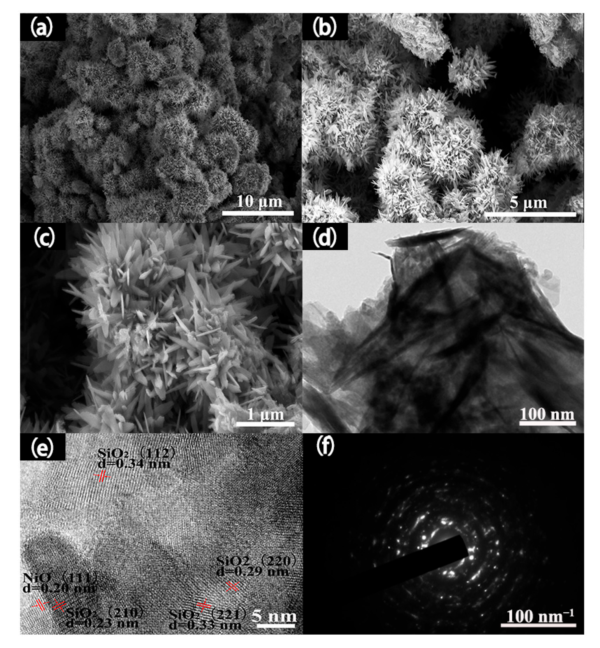 Figure 3. (ac) SEM images; (d) TEM image; (e) HRTEM image, and (f) the corresponding SAED pattern of the as-synthesized hierarchical NiO-SnO2 nanoflowers.
