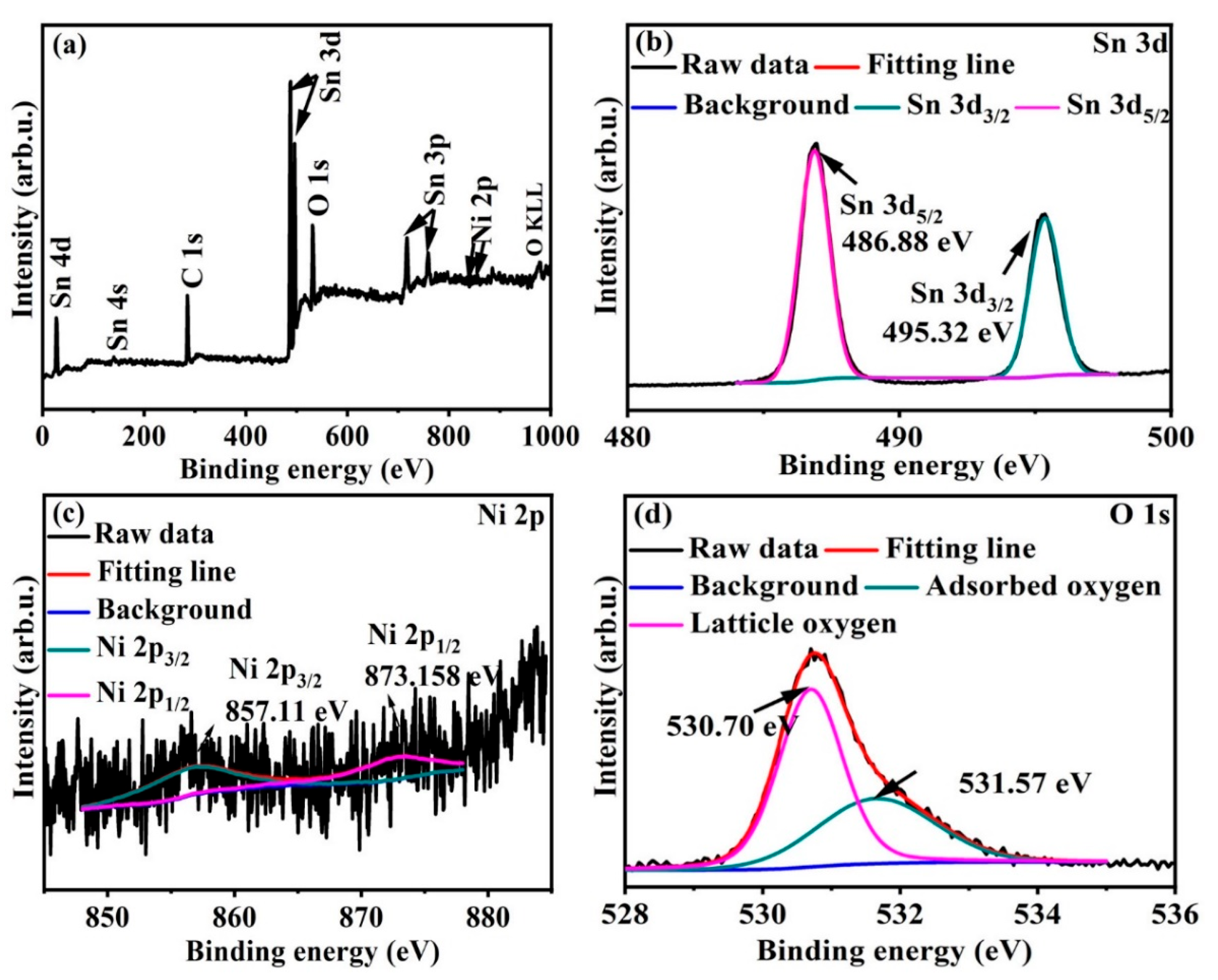 Figure 4. X-ray photoelectron spectroscopy measurement of hierarchical NiO-SnO2 nanoflowers. (a) The full rang XPS spectrum; (b) Sn 3d; (c) Ni 2p; (d) O 1s.
