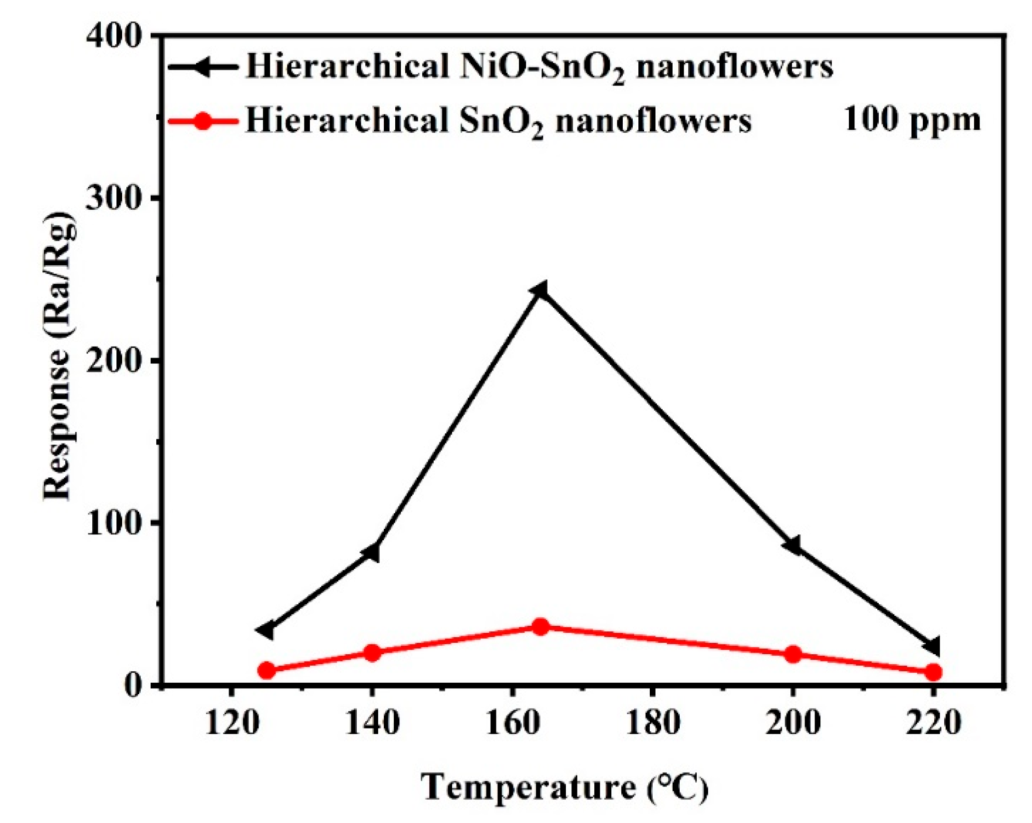 To investigate the effect of NiO doping on hierarchical SnO2 nanoflowers gas sensing performance, pure hierarchical SnO2 nanoflowers and hierarchical NiO-SnO2 nanoflowers gas sensors were designed, and the gas sensing properties to ethanol were examined. It is well known that the operating temperature has an important influence on the gas sensing behavior of the sensors. And the relationship between the gas response and the operating temperature has been studied to explore the optimal operating temperature, as displayed in Figure 5. As shown in Figure 5, it is obvious that the responses to ethanol for both sensors increase firstly and then decrease when the operating temperature is increased. This phenomenon is attributed to the kinetics and thermodynamics of gas adsorption and desorption on the sensing material surface [57]. The rate of reaction between ethanol and surface-adsorbed oxygen species will be increased when the operating temperature is increased. But when the operating temperature is more than the optimal operating temperature, the response of the sensor will show a decrease tendency, which is attributed to the ethanol adsorption active site decreasing caused by the desorption rate is faster than the adsorption rate. Meanwhile, the catalytic role of NiO also promotes the hierarchical NiO-SnO2 nanoflower heterojunction gas sensor owns good gas sensing response and low working temperature [58]. Therefore, the optimal operating temperature for both sensors based on the hierarchical pure SnO2 nanoflowers and hierarchical NiO-SnO2 nanoflowers is determined to be 164 °C.