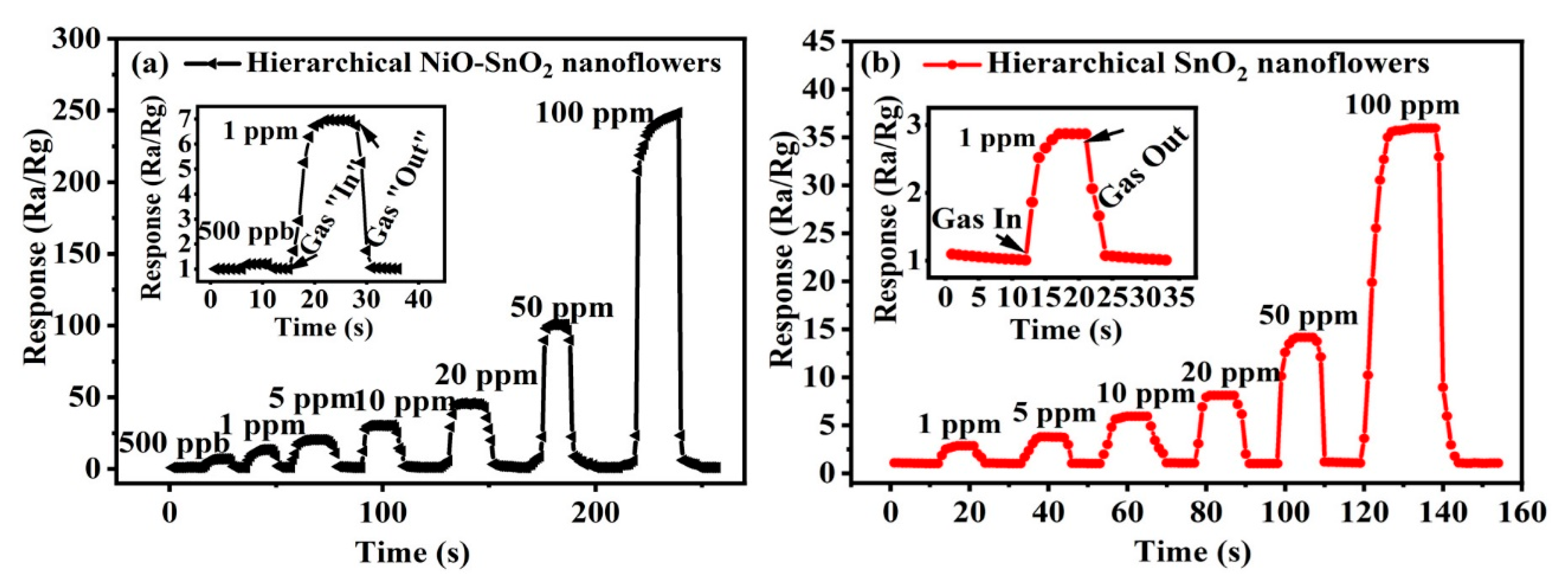 Figure 6. Dynamic gas sensing response and recovery curve of the sensor based on the hierarchical SnO2 nanoflowers and hierarchical NiO-SnO2 nanoflowers sensors to 1 ppm–50 ppm (a) and 500 ppb-50 ppm (b), respectively.