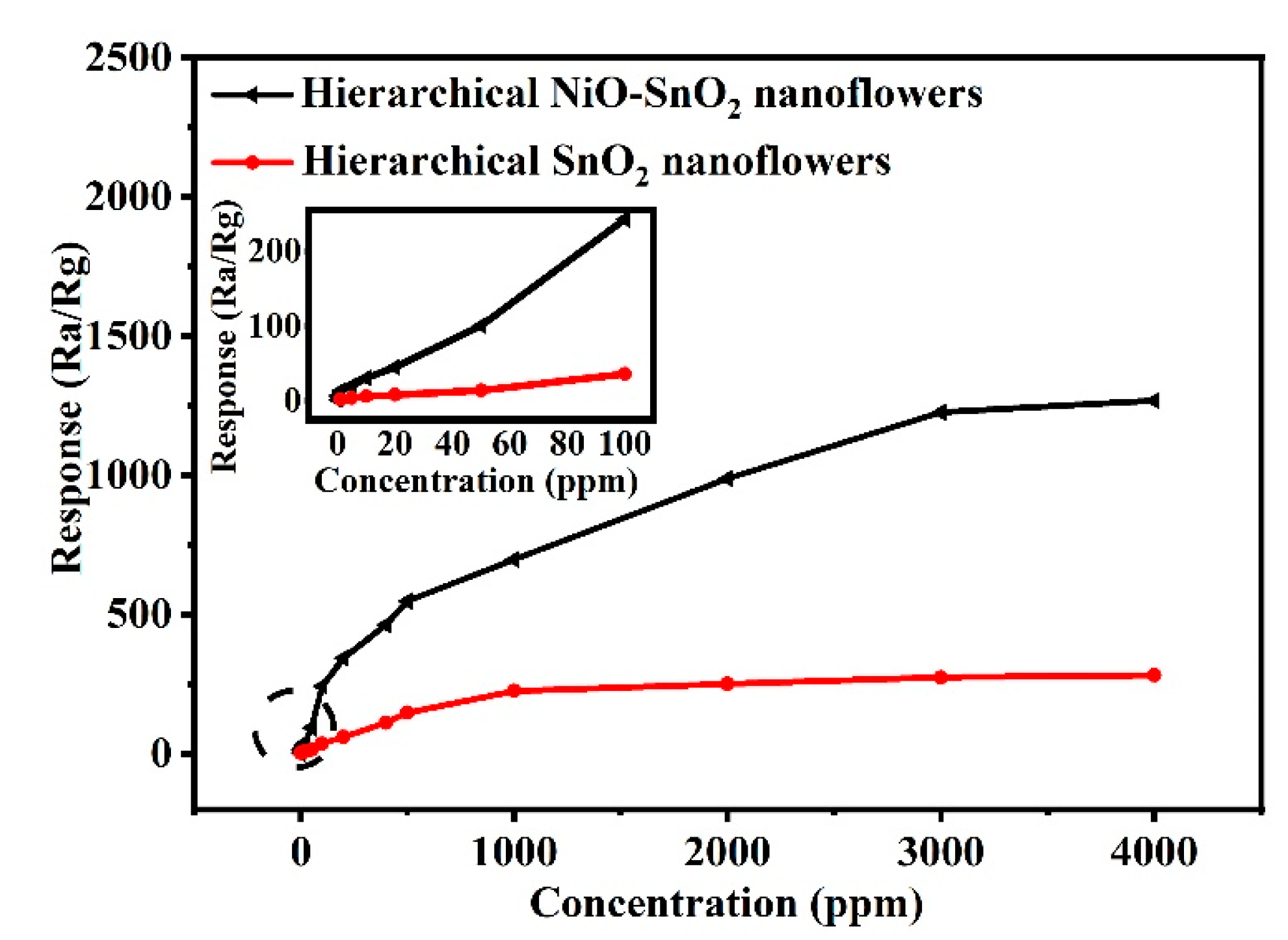 Figure 7 presents the dynamic response curves of the hierarchical SnO2 nanoflower sensor and the hierarchical NiO-SnO2 nanoflower sensor to ethanol at 164 °C. The responses of both hierarchical SnO2 nannoflowers and hierarchical NiO-SnO2 nanoflower sensors rise sharply with increasing ethanol concentration, but the increase slows markedly once the concentration of ethanol is more than a fix value and, finally, the response of two sensors increased very slow and then keep stable, which could be explained by the theory that surface adsorptions gradually saturated with the increasing concentration [63,64]. More importantly, the response of the hierarchical NiO-SnO2 nanoflowers sensor exhibits a higher response value than that of the hierarchical SnO2 nanoflowers sensor towards different ethanol concentrations ranging from 1 ppm to 50 ppm. The hierarchical NiO-SnO2 nanoflowers sensor can also detect ethanol gas with a response of 1.2 when the concentration of ethanol is 500 ppb. The above results demonstrate that NiO doped into SnO2 can efficiently improve the gas sensing properties, and this hierarchical NiO-SnO2 nanoflowers gas sensor is suitable for the detection of ethanol at a low concentration.