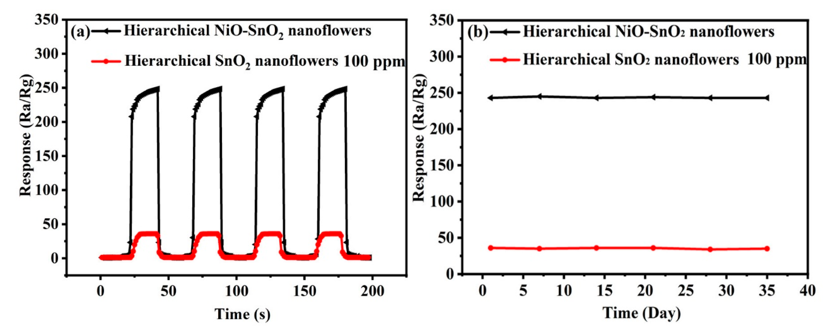The reproducibility and stability are important index to evaluate gas sensing properties of the as-obtained gas sensors [65]. Figure 8a displayed the response and recovery curves with four cycles of hierarchical SnO2 nanoflowers and hierarchical NiO-SnO2 nanoflowers. As shown in this picture, there is no clear change in the response value after four cycles of gas sensing examination to 100 ppm ethanol at 164 °C, which illustrates that the hierarchical SnO2 nanoflowers and hierarchical NiO-SnO2 nanoflowers sensors have reproducibility. Meanwhile, the stability of the two sensors has been measured in Figure 8b. From this picture, it can be clearly seen that the sensors almost show a similar response value after 35 days, which demonstrates that the sensors made of hierarchical SnO2 nanoflowers and hierarchical NiO-SnO2 nanoflowers sensors exhibit long-term stability.