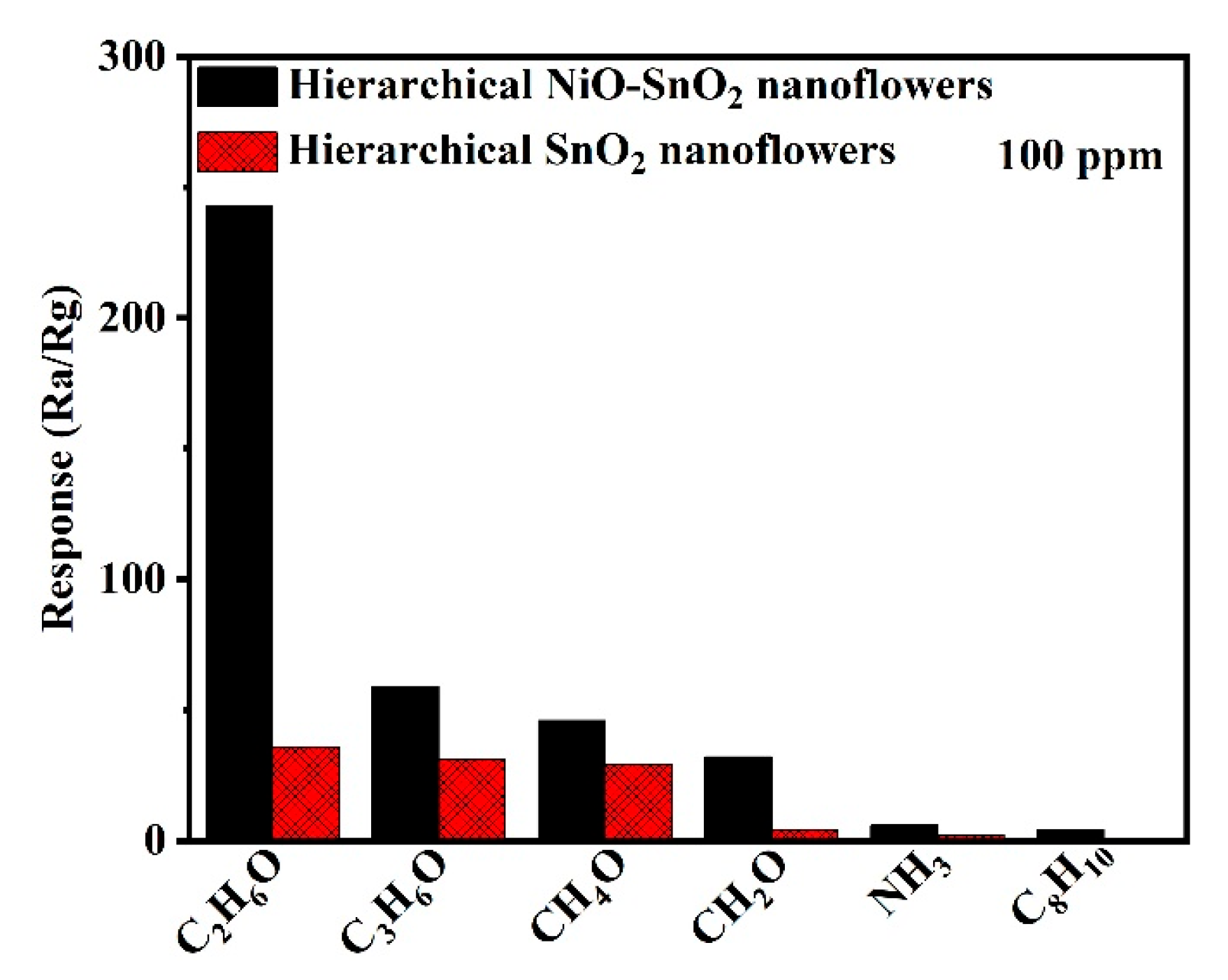 Figure 9. Response of hierarchical NiO-SnO2 nanoflowers and hierarchical SnO2 nanoflowers towards 100 ppm ethanol, acetone, methanol, formaldehyde, ammonia, and paraxylene gas molecules at 164 °C.