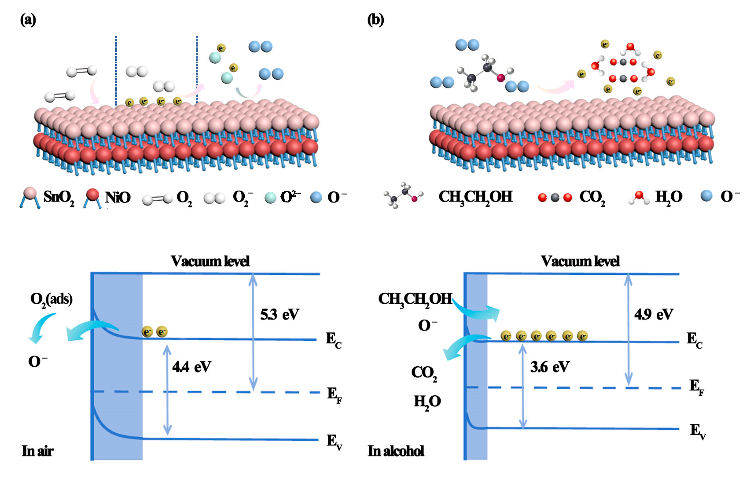 Figure 10. The mechanism diagram (a) and energy band structure diagram (b) of hierarchical NiO-SnO2 nanoflowers for ethanol gas molecules.