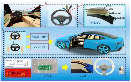 Triboelectric nanogenerators (TENGs) are an innovative technology for energy harvesting and have attracted significant global attention since their inception [1,2]. TENG sensors are widely utilized for respiration monitoring, vibration and sound sensing, tactile and pressure measurements, and wearable sensor technologies [3,4,5,6]. A number of TENG sensors that can track and recognize a wide range of human activities, such as hand motions, breathing, posture, walking patterns, lip movements, and waist activity, have been developed recently [7,8,9,10,11,12]. Previous advances focused on the application of TENG-based human–computer interface sensors for identifying driver behaviors in semi-automated driving scenarios remain scarce. The introduction of highly automated driving systems in automobiles is considered a revolutionary strategy to increase the effectiveness of urban transportation on a broad scale [13]. In order to maintain operational safety, Level 3 autonomous driving systems require drivers to take on crucial vehicle takeover duties [14]. If they need to take control again, drivers must continue to hold their hands on the steering wheel and concentrate on the road ahead. The drivers are exposing themselves to serious danger when they take their hands off the steering wheel to do things like take a nap or answer the phone [15,16].