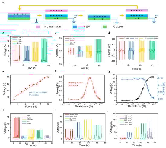 The output characteristics of the TENG device. (a) TENG working mechanism, (b) open−circuit voltage, (c) short−circuit current, and (d) transferred charge under different operating frequencies. (e) The changes in output voltage under different applied pressures. Relationships between (f) load voltage, current, and (g) output power under different load resistances. Figure 2g shows a comparison of the open−circuit voltage outputs for (h) various triboelectric materials, (i) device area and (j) triboelectric materials with different thicknesses.