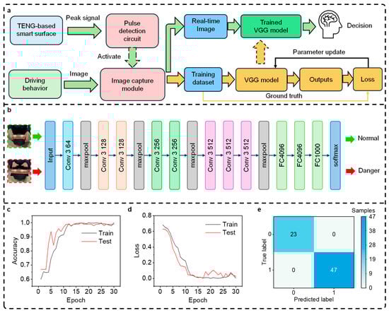The working principle of the smart surface sensing system based on machine learning. (a) The data processing workflow for the deep learning-based steering wheel hand detection model during both the training and testing phases. (b) The architecture of the VGG model. (c) The prediction accuracy and (d) the loss function for the training and testing sets. (e) The confusion matrix of the prediction results.