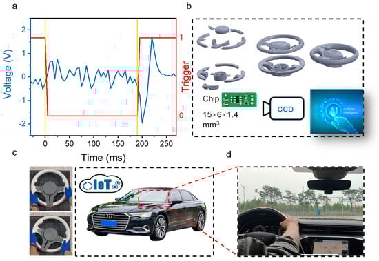 Figure 4b shows the 3D-printed steering wheel structure and the IoT chip. To evaluate the performance of the smart surface, a full-scale (1:1) automotive steering wheel model was fabricated using fused deposition modeling (FDM) 3D printing technology (X1C, Bambu Lab) with polylactic acid (PLA) filament. The model design was sourced from open-source community repository (makerworld.com (accessed on 1 September 2025)) with the Profile ID 997121. A TTP223 touch pad detector IC was employed to monitor the voltage signal generated by the TENG. The IC was connected to a Xiaomi IoT switch module. When the driver’s hand touches or releases the steering wheel, the TENG sensor on the surface generates a voltage signal, which is detected and digitized by the TTP223 IC. The IC then triggers the IoT switch, activating the Xiaomi camera for image acquisition.