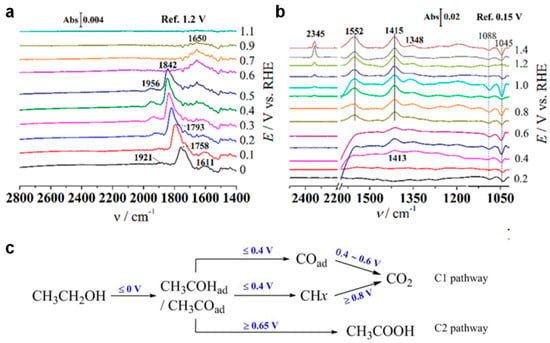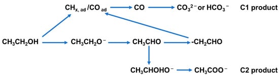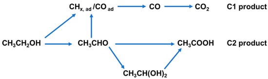 - Camara, G.A.; Iwasita, T. Parallel pathways of ethanol oxidation: The effect of ethanol concentration. J. Electroanal. Chem. 2005, 578, 315–321. [Google Scholar] [CrossRef]