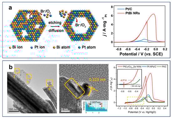 - Peng, H.; Ren, J.; Wang, Y.; Xiong, Y.; Wang, Q.; Li, Q.; Zhao, X.; Zhan, L.; Zheng, L.; Tang, Y.; et al. One-stone, two birds: Alloying effect and surface defects induced by Pt on Cu2−xSe nanowires to boost C-C bond cleavage for electrocatalytic ethanol oxidation. Nano Energy 2021, 88, 106307. [Google Scholar] [CrossRef]