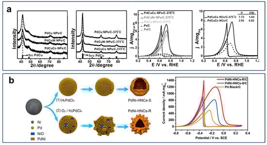 - Chen, Z.; Zhang, J.; Zhang, Y.; Liu, Y.; Han, X.; Zhong, C.; Hu, W.; Deng, Y. NiO-induced synthesis of PdNi bimetallic hollow nanocrystals with enhanced electrocatalytic activities toward ethanol and formic acid oxidation. Nano Energy 2017, 42, 353–362. [Google Scholar] [CrossRef]