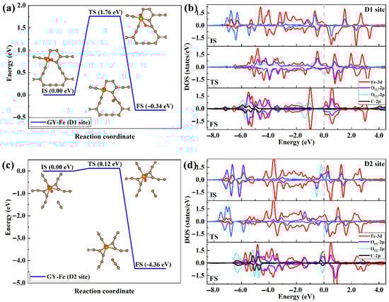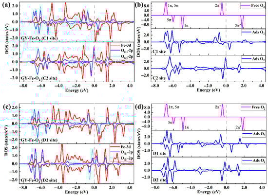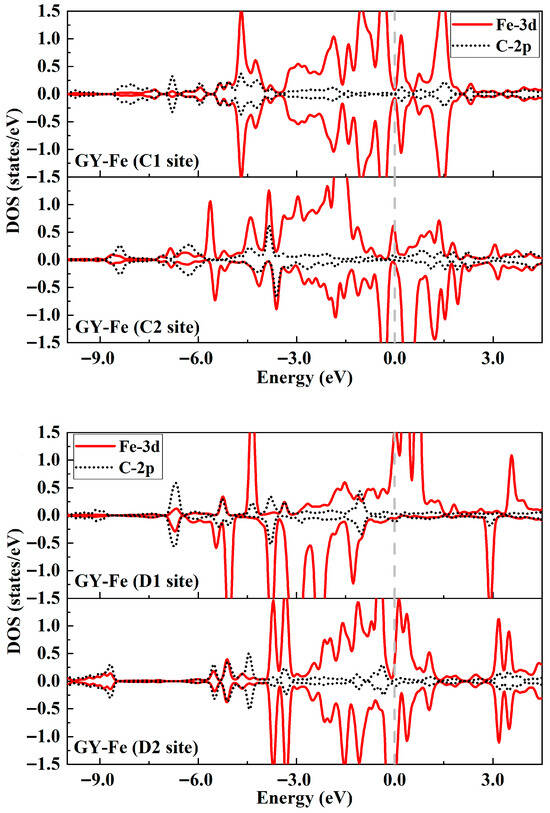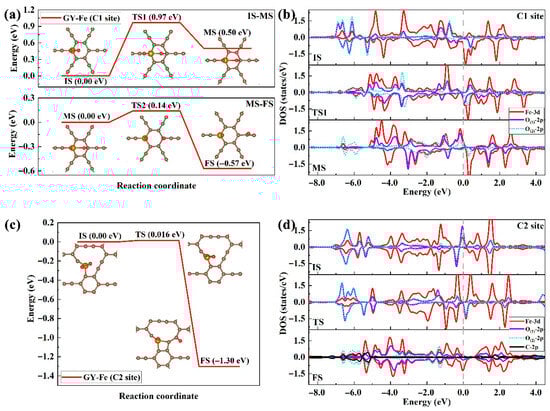 3.2. Activation and Dissociation Behaviors of O2 on GY-Fe Surfaces