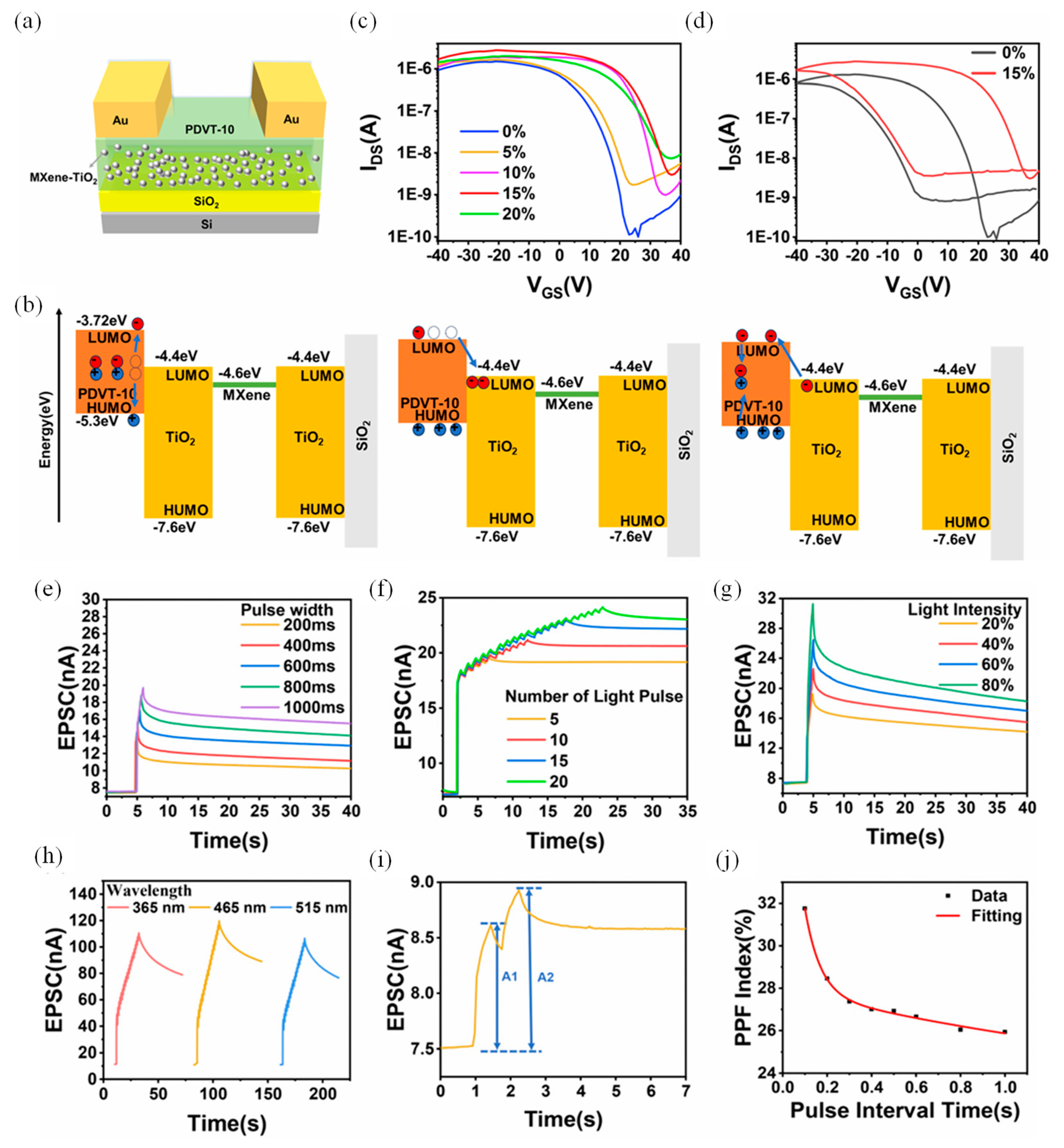MXene-based optoelectronic synaptic transistors (MXene–TiO2–PDVT-10 composite) | STM-LTM transition, PPF (dual-exponential decay), Multispectral sensitivity | Hierarchical responses and attentional mechanisms | [130] |