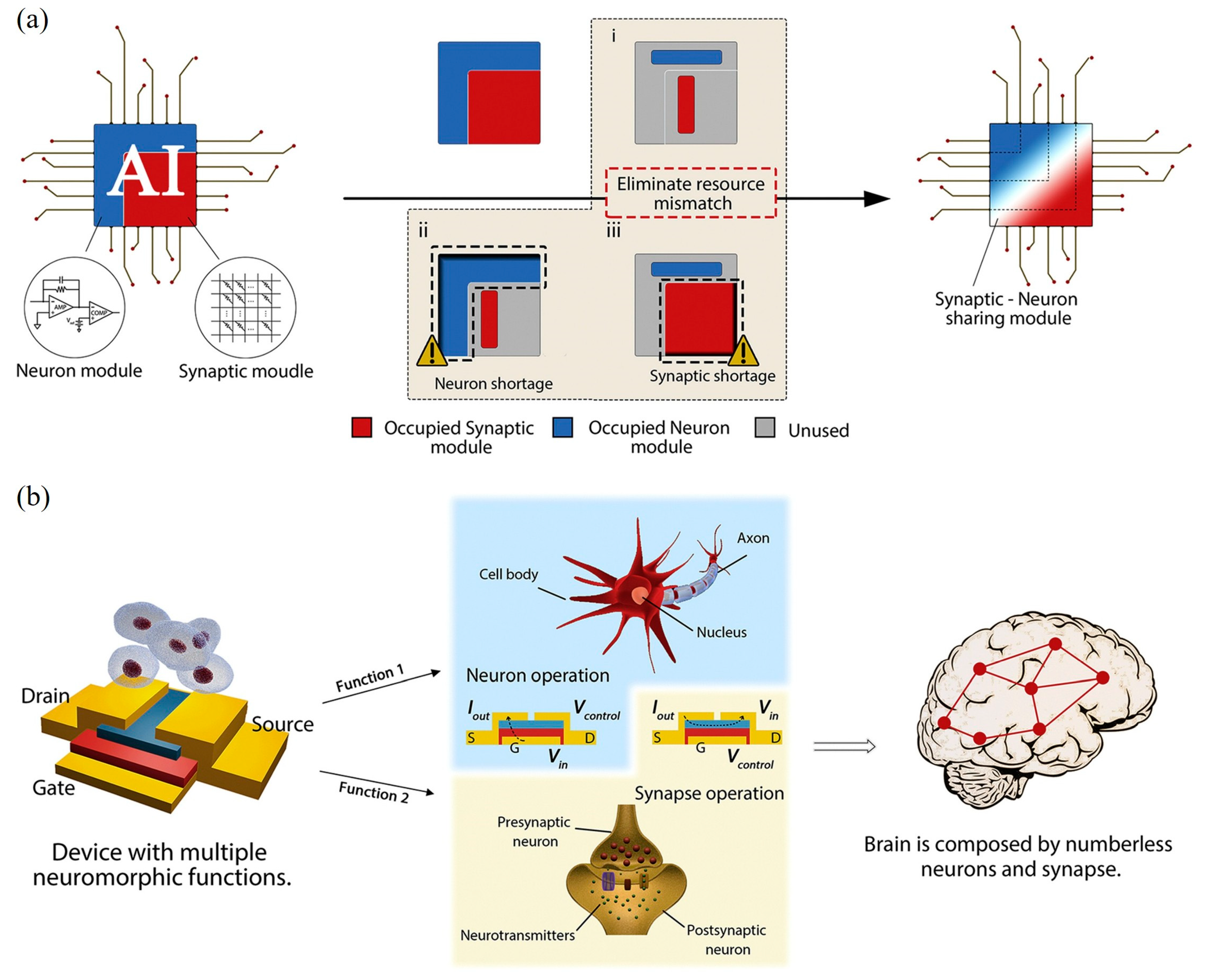 b) The core of a neuromorphic chip with synaptic–neuronal sharing modules is a multifunctional device capable of performing both synaptic and neuronal functions, with the ability to switch between them via simple electronic programming [