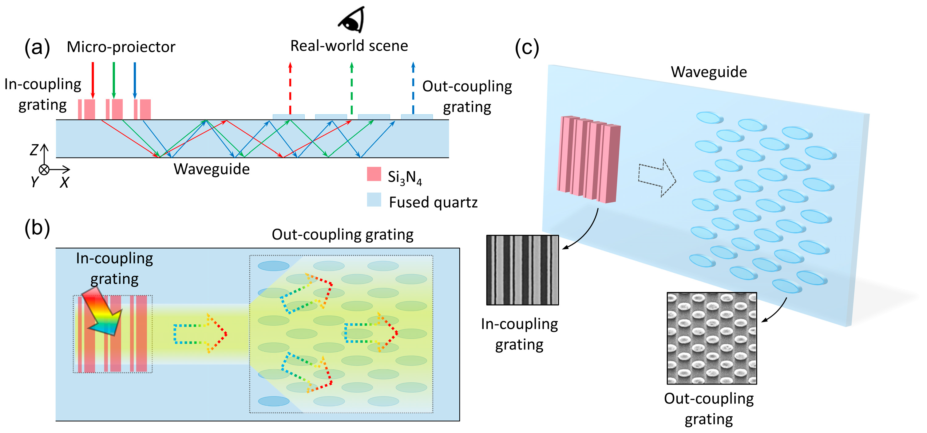 Figure 1. Schematics of a dielectric waveguide-based meta grating-waveguide. (a) Side view: Light from a micro-projector couple in via an in-coupling grating, propagates through total internal reflection in the Si3N4-glass waveguide, and couples out for viewing with the real-world scene. Here, the red, green, and blue arrows in the figure represent visible light, and the same arrows used elsewhere in the text carry the same meaning. (b) Top view: Depicts light coupling and propagation via the in-and out-coupling gratings. (c) Grating structures: Illustrates the evolution of in-and out-coupling gratings into nanostructured forms for light manipulation.