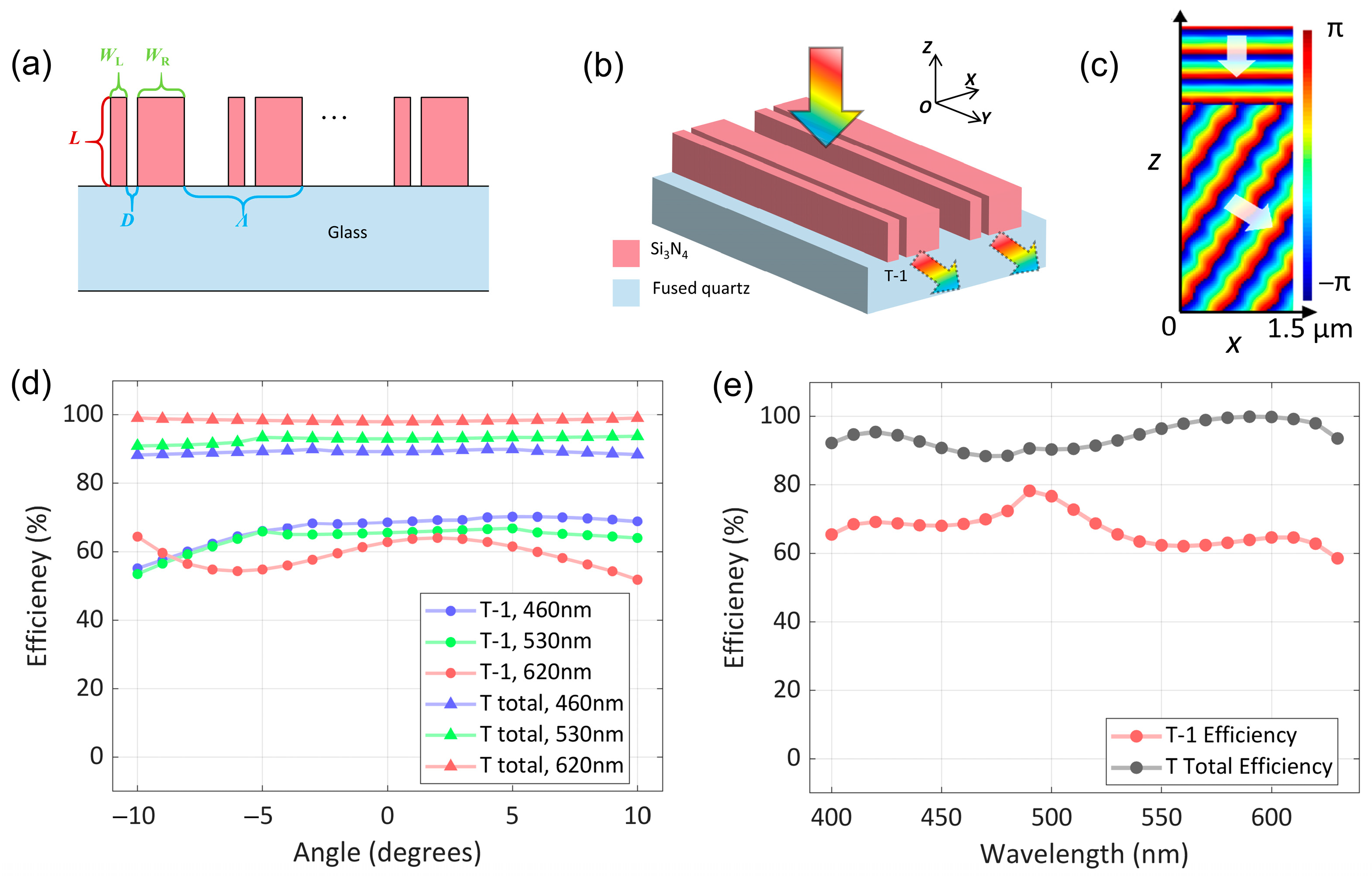 Figure 2. Schematics and performance of a Si3N4 meta-grating for in-coupling. (a) Schematic of the meta-grating structure on a glass substrate, with nano-pillars of varying widths. (b) 3D view illustrating light coupling into the meta-grating and propagation. (c) Simulated phase distribution in the xz-plane, showing phase difference between nano-pillars. (d) Simulated efficiency of the meta-grating versus incident angle at wavelengths 460 nm, 530 nm, and 620 nm. (e) Simulated efficiency of the meta-grating versus wavelength, with data for first-order (T-1) and total (T total) diffraction efficiencies.