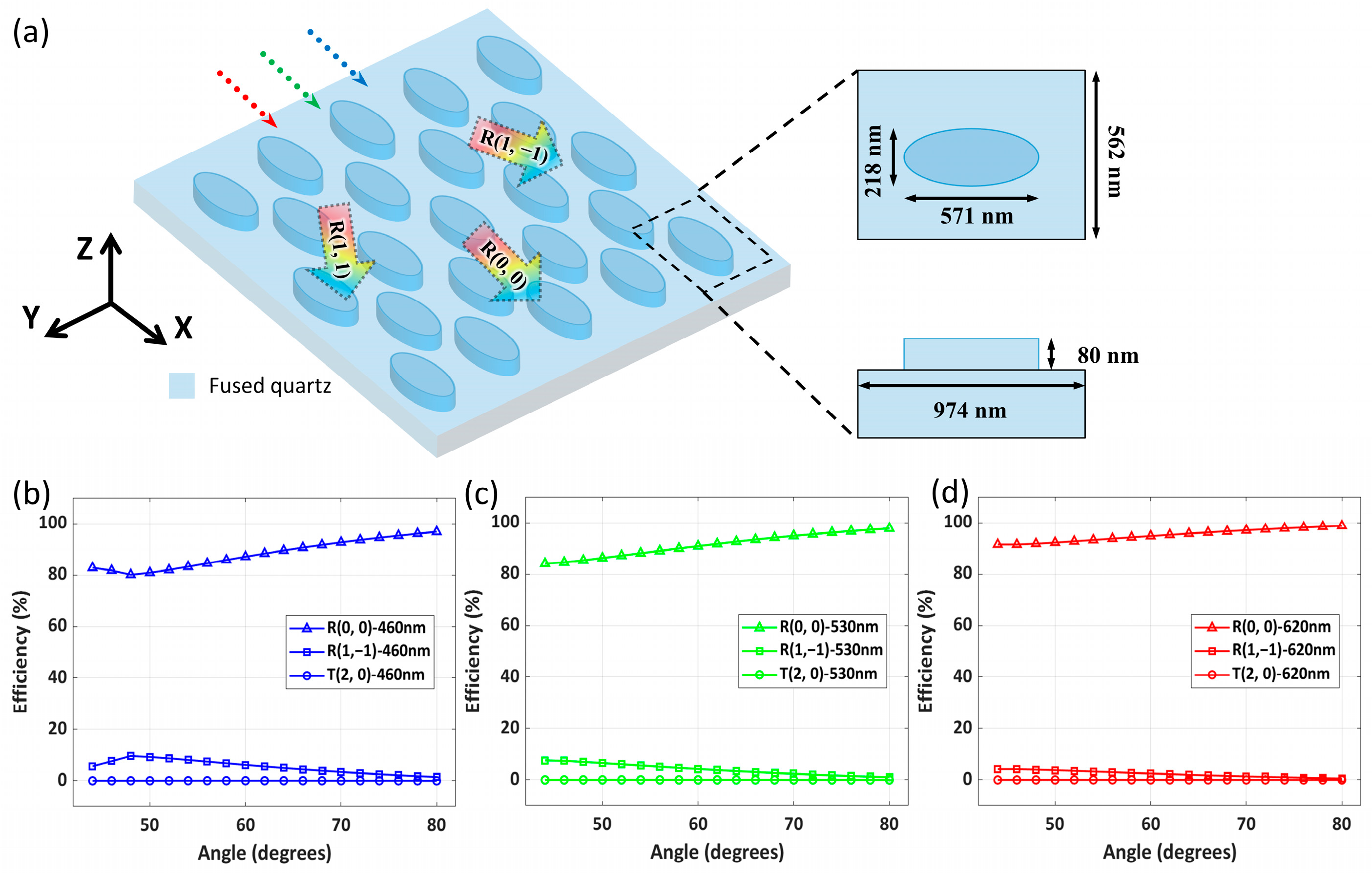 Figure 3. Schematics and diffraction efficiency of an elliptical meta-grating for out-coupling. (a) 3D schematic of the elliptical meta-grating on a glass substrate, with inset showing unit cell dimensions. (bd) Simulated absolute diffraction efficiencies versus incident angle (40–80°) at wavelengths (b) 460 nm, (c) 530 nm, and (d) 620 nm, for specified diffraction orders.