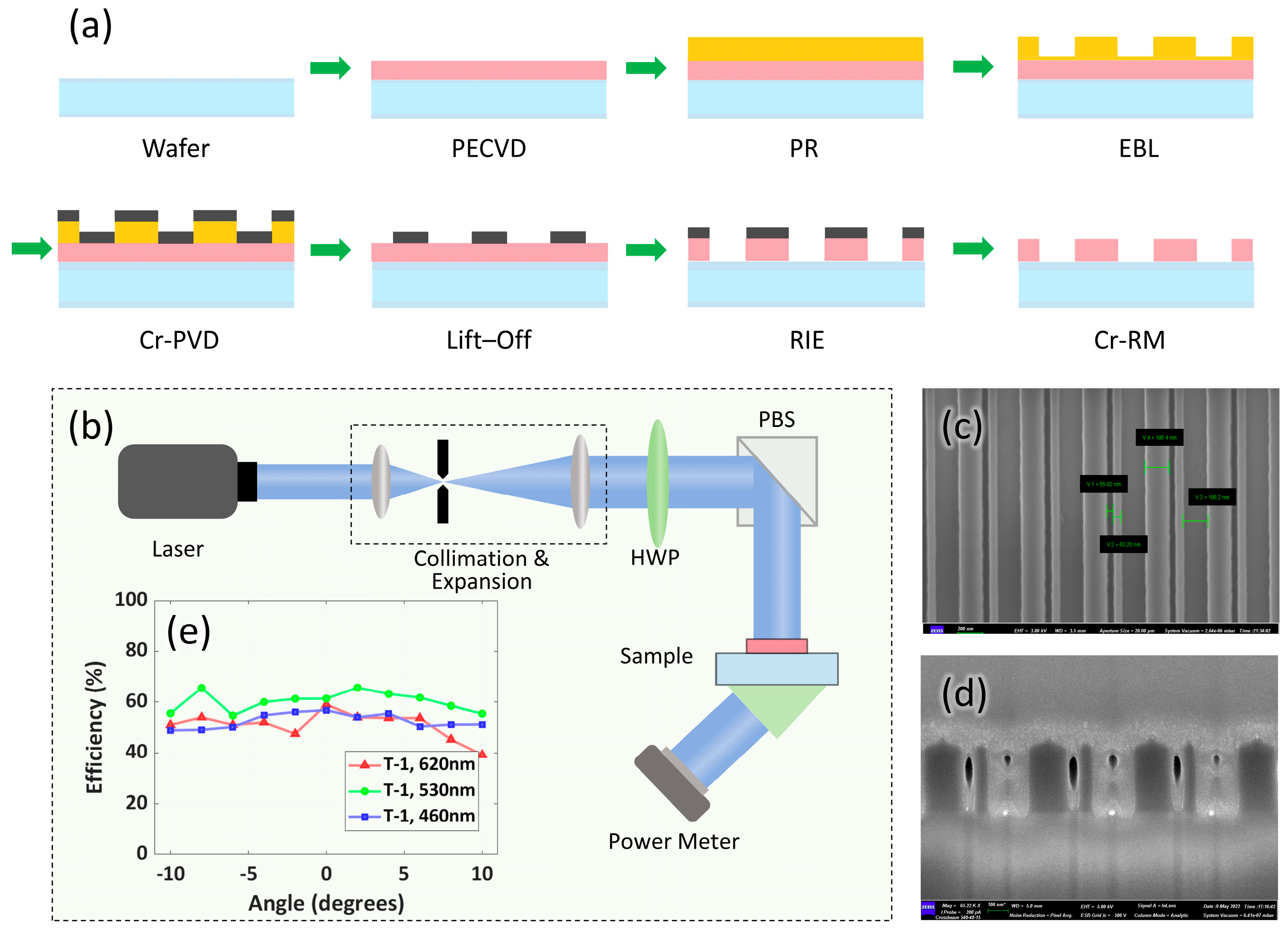 Figure 4. Fabrication, characterization, and performance of meta-gratings. (a) Fabrication process flow for meta-gratings, involving PECVD, EBL, RIE, etc. (b) Experimental setup for measuring in-coupling efficiency, with laser, collimation/expansion, and power meter. (c,d) SEM images of meta-gratings (scale bar: 500 nm). (e) Measured absolute first-order diffraction efficiency of the meta-grating across visible wavelengths (460 nm, 530 nm, 620 nm) versus incident angle.