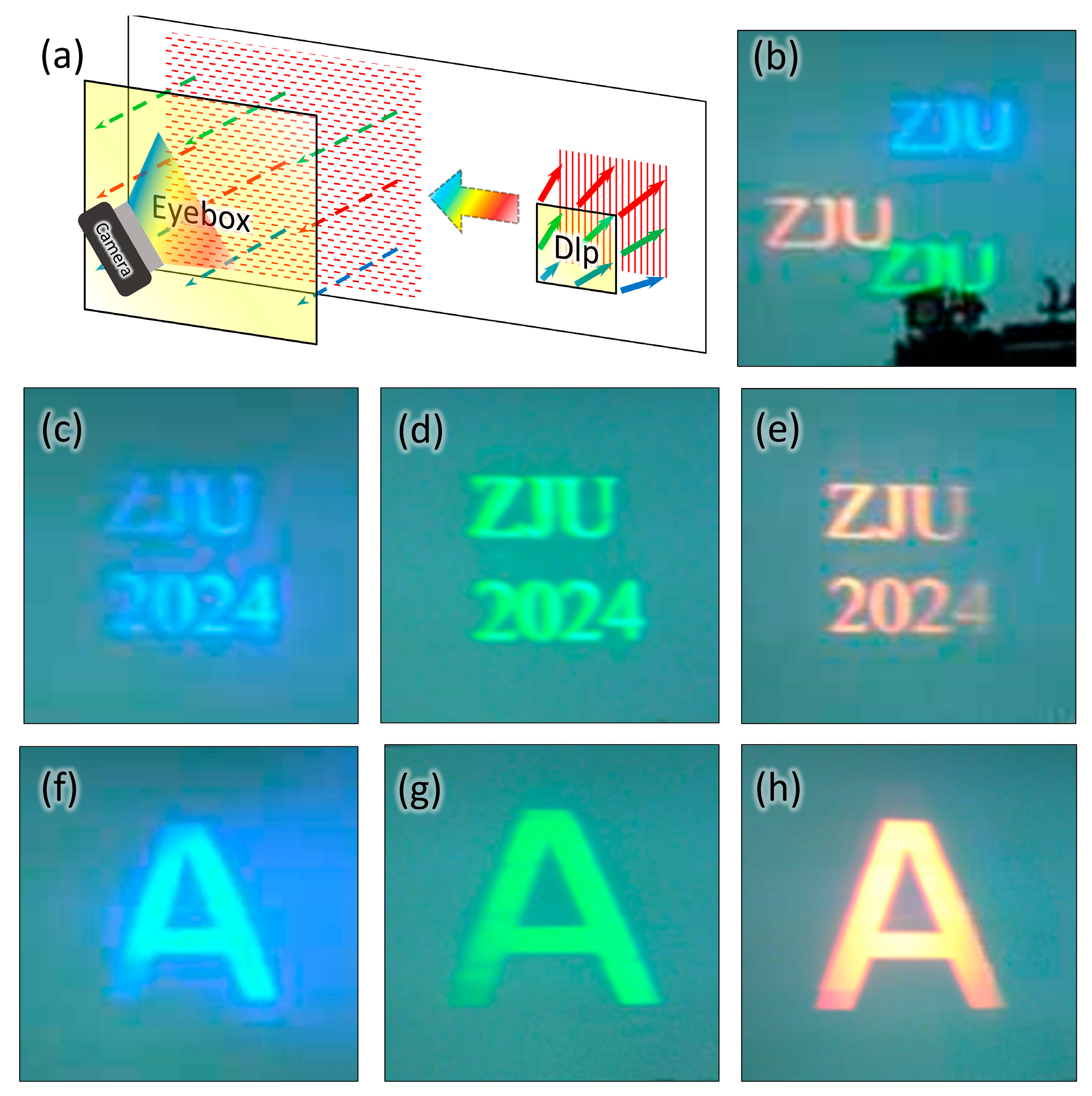 Figure 5. Demonstration of color virtual image display via a meta-grating-based stereoscopic waveguide. (a) Schematic of color virtual images (with eye-box) overlapping an ambient scene, received by a camera. (b) Captured image of “ZJU” color virtual images overlaid on an ambient scene. (ce) Captured “ZJU 2024” images in blue color (c), green (d), and red (e). (fh) Captured “A” images in blue (f), green (g), and red (h).