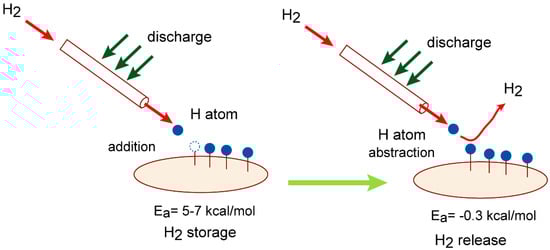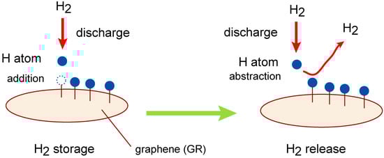 In case of a H2 storage process, first, the H2 gas is introduced into the reaction tube and H2 is discharged. The hydrogen atom (H atom) is easily generated: H2 + discharge → H + H. The H atom reacts with the carbon atom of the GR surface and GR-H and H-(GR)–H (hydrogenated GRs) are formed: