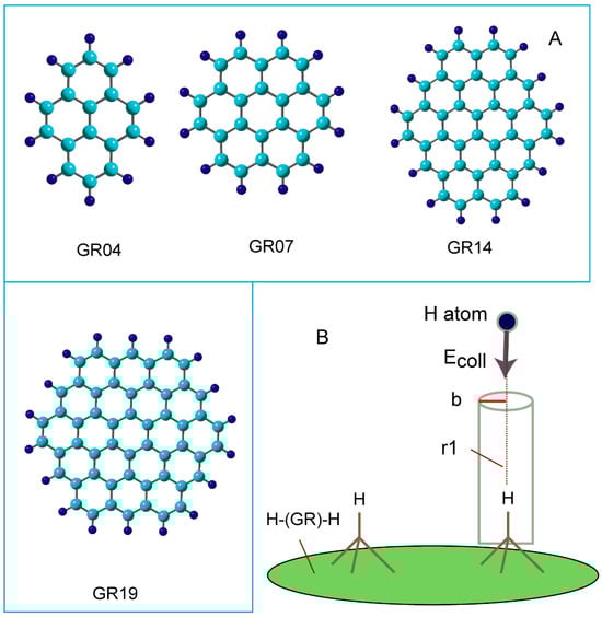 (A) Graphene (GR) nanoflakes used in the present study as a carbon material. GR04, GR07, GR14, and GR19 are composed of 4, 7, 14, and 19 benzene rings, respectively. The carbon atoms in the edge region are terminated by hydrogen atoms. (B) Initial geometry configuration in hydrogen abstraction reaction, H + H-(GR)-H → H2 + (GR)-H, at time zero in direct ab initio MD calculations. Notation “r1” means distance of collisional hydrogen atom from hydrogen atom on H-(GR)-H (hydrogenated GR), and “b” means the impact parameter in collision system.