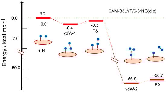 Energy diagram of reaction system along the hydrogen abstraction reaction: hydrogenated GR14 at reactant state (RC: H-(GR)-H), van der Waals states (vdW-1 and 2), transition state (TS), and product state (PD: GR-H). The distances and bond lengths are in Å. The calculations were carried out at the CAM-B3LYP/6-311G(d,p) level. GR19 was used as GR nanoflake.