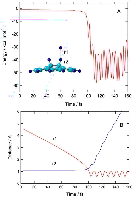 Time evolution of (A) potential energy and (B) interatomic distances of reaction system (r1 and r2). Direct AIMD calculations were performed at the CAM-B3LYP/6-31G(d) level. The CAM-B3LYP/6-31G(d)-optimized geometry of H-(GR)-H was used as the initial geometries of H-(GR)-H at time zero.