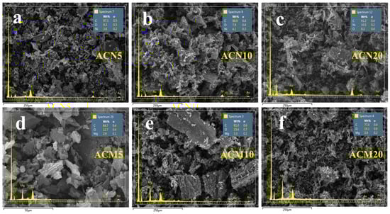 SEM images and EDX elemental mapping of activated carbon modified with different Mg and Ni loadings: (a–c) ACM5, ACM10, ACM20; (d–f) ACN5, ACN10, ACN20.