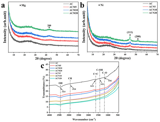 (a) XRD patterns of Mg–modified samples; (b) XRD patterns of Ni–modified samples; (c) FTIR spectra of pristine and modified activated carbon samples.
