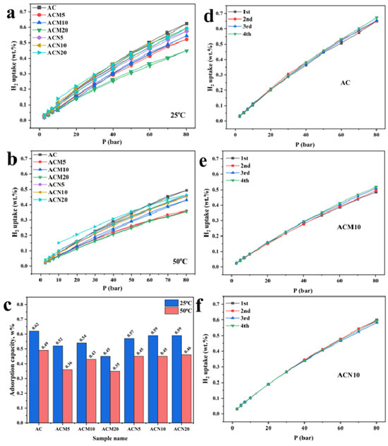 (a) H2 adsorption–desorption isotherms at 25 °C; (b) H2 adsorption–desorption isotherms at 50 °C; (c) hydrogen uptake at 80 bar; (d) cyclic adsorption–desorption performance of AC at 25 °C; (e) cyclic performance of ACM10 at 25 °C; (f) cyclic performance of ACN10 at 25 °C.