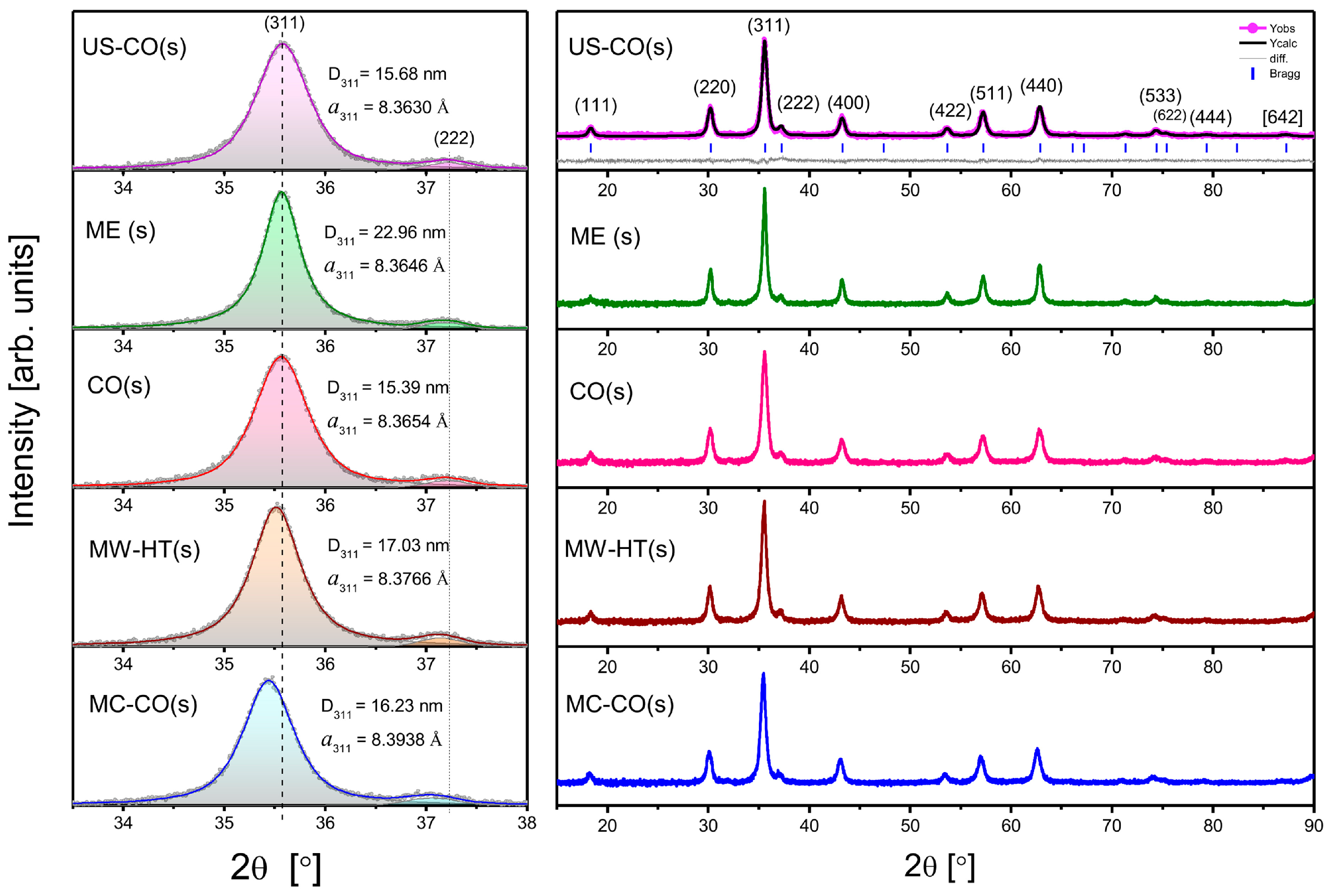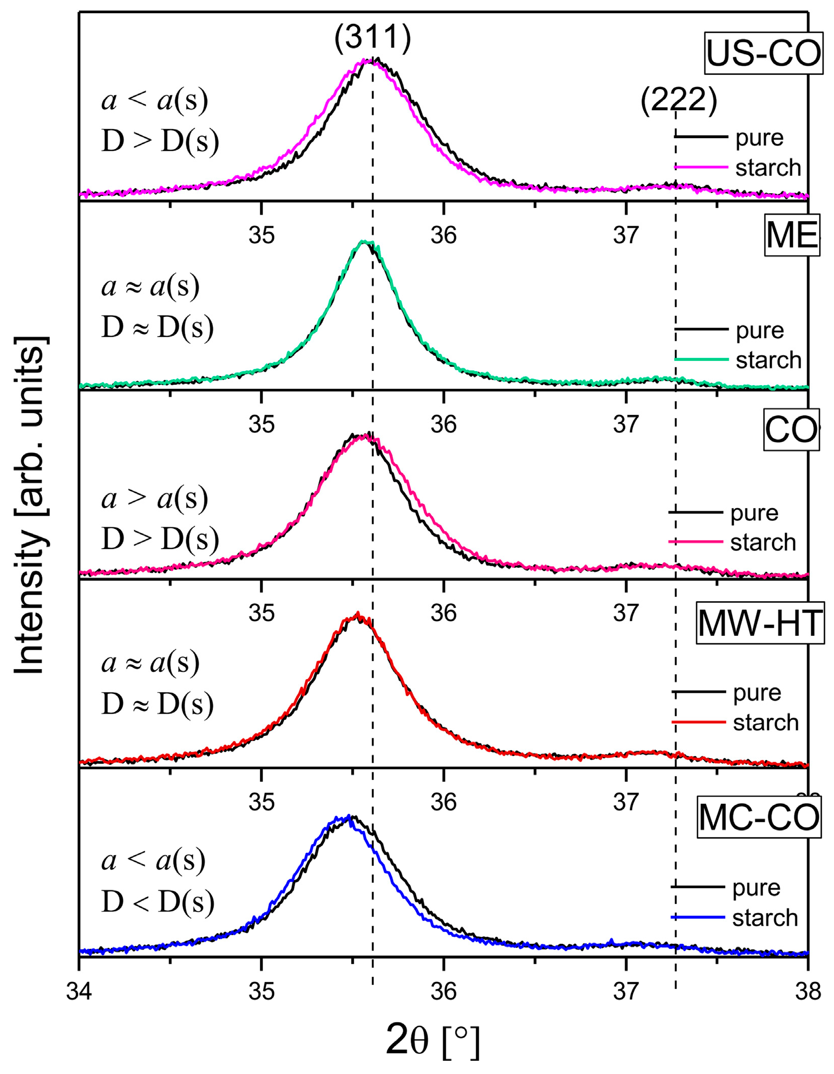 Figure 2 shows 2 θ region from 34° to 38° of the normalized X diffractograms of the uncoated (bare) and starch-coated nanomaterials with (311) Bragg reflection. It can be clearly seen that the smaller nanoparticles US-CO, CO and MC-CO, with broader (311) reflections, underwent major changes during the starch coating process. Careful analysis of the diffractograms of coated nanoparticles provided quantitative data on the effect of the coating process itself on the starting nanomaterials.