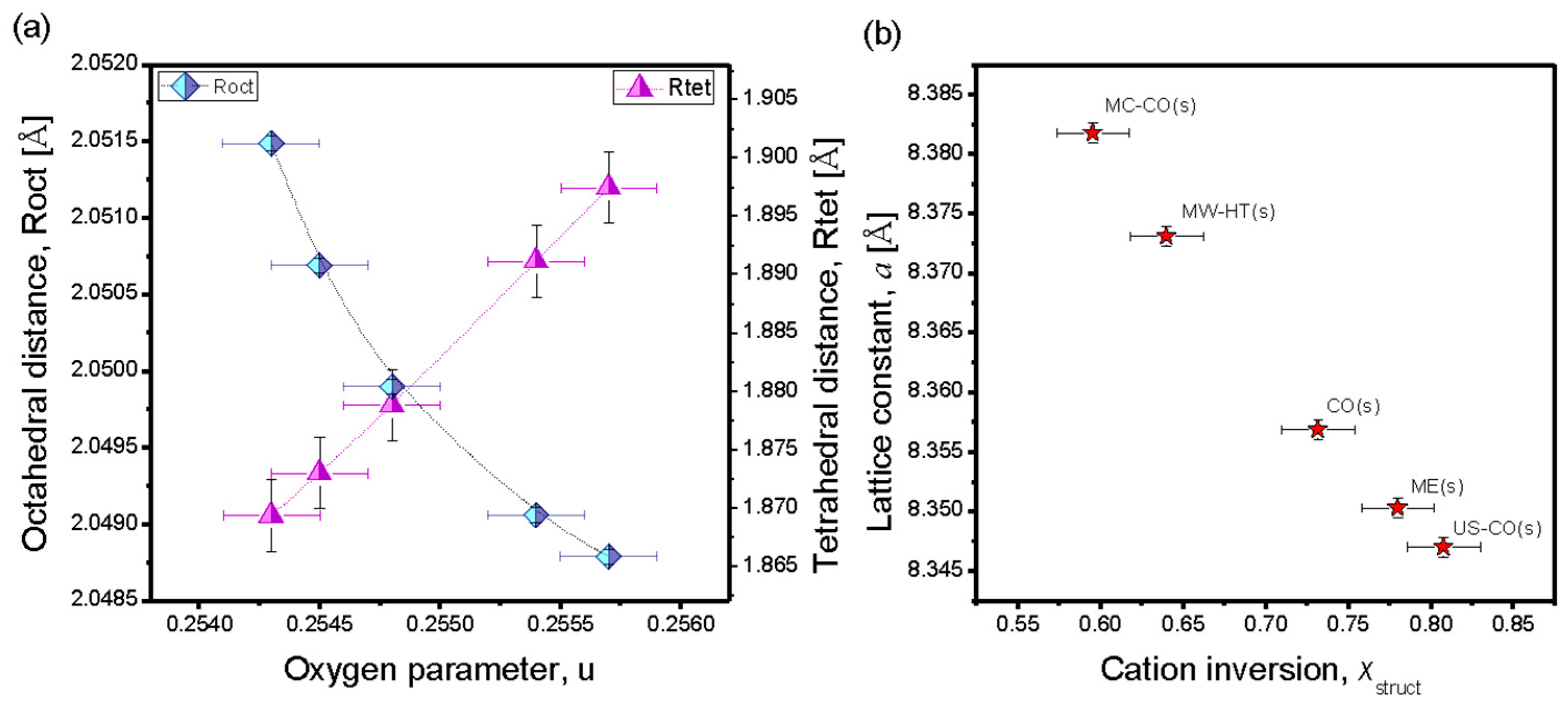 It is known that the refinement of the diffractogram according to Rietveld is not sufficiently sensitive for the inversion of cations whose atomic factors are of similar size. Therefore, XRD structure analysis was used to estimate more reliable values for cation inversion.
