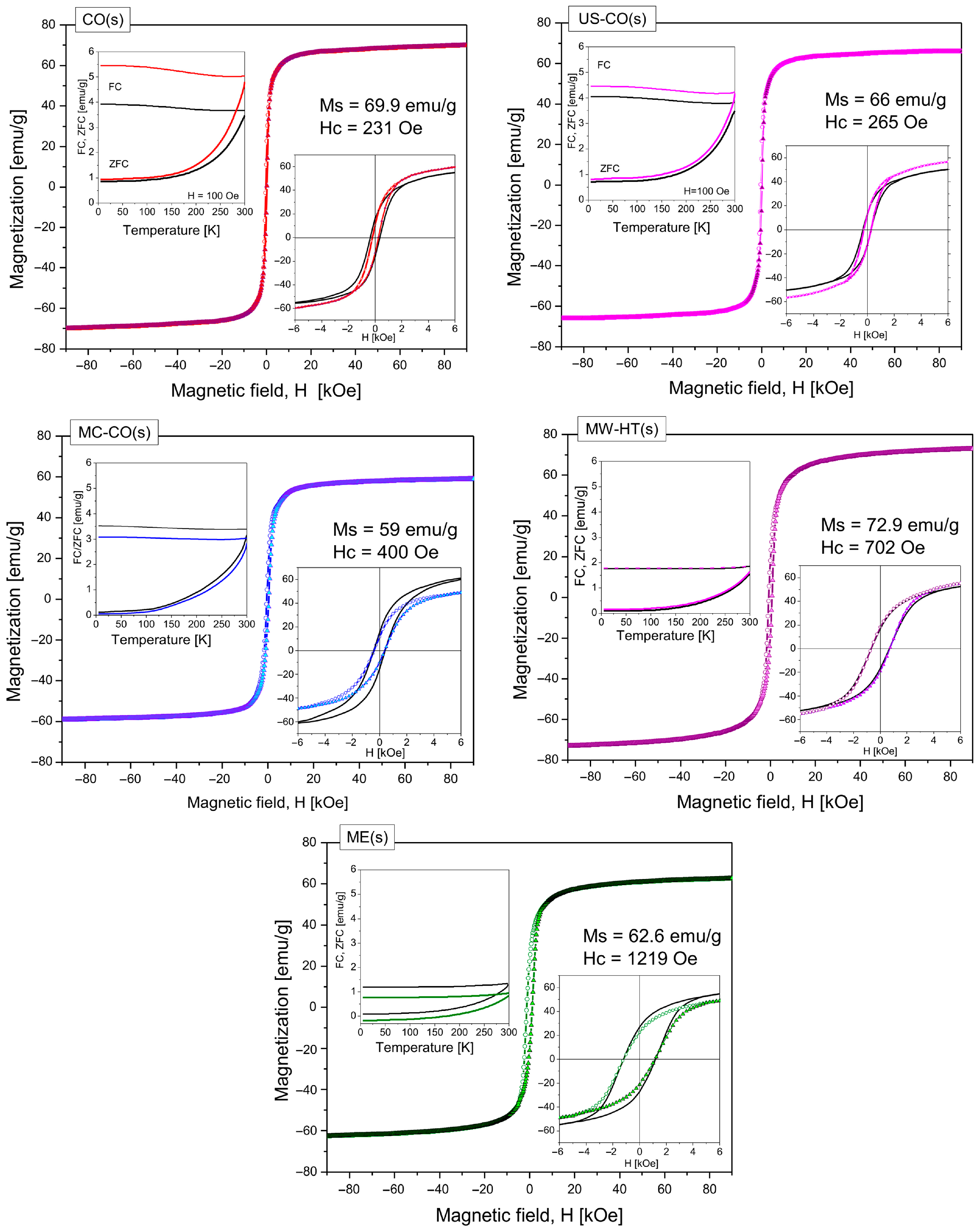Figure 5. To make it easier to see the changes that occurred during the starch coating process, along with the magnetic hysteresis of the starch-coated nanomaterials, the hysteresis loops of the pure counterparts are also given. The same was applied to the results of FC/ZFC magnetization measurements. The left insets of the graphs for certain nanomaterials show the magnetizations of both the pure and coated counterparts together. All data were recorded during heating from 0 to 300 K in a weak magnetic field,
