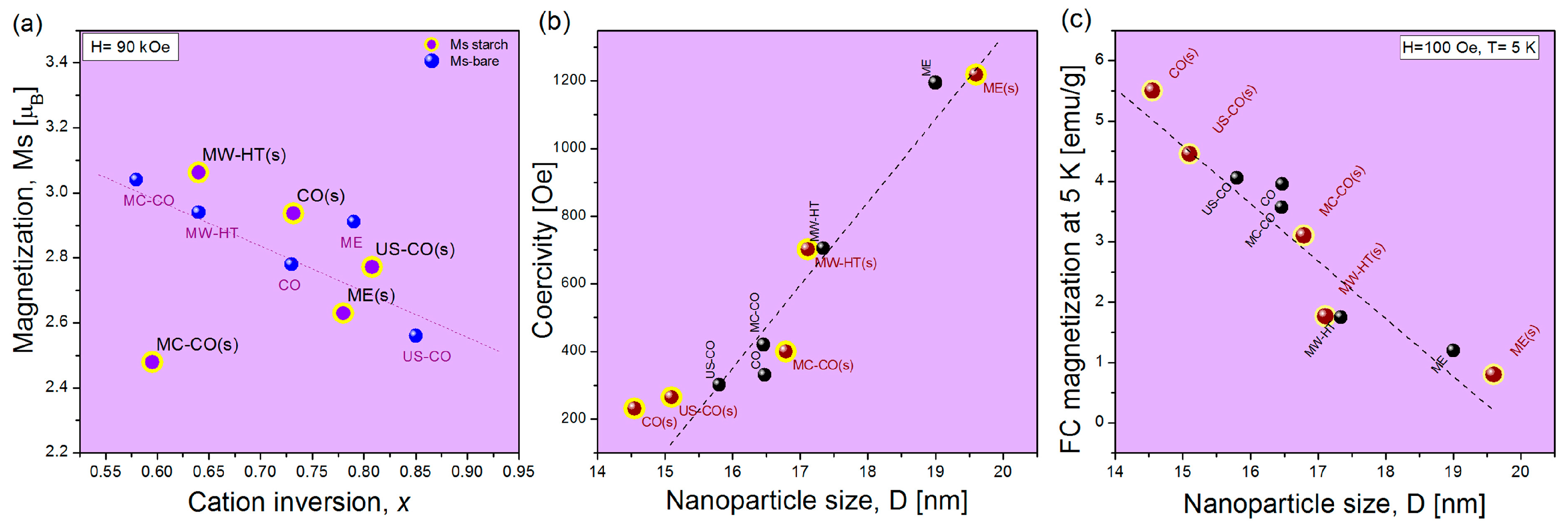The results of magnetic measurements of starch-coated cobalt ferrite nanoparticles obtained by various synthesis methods are shown in