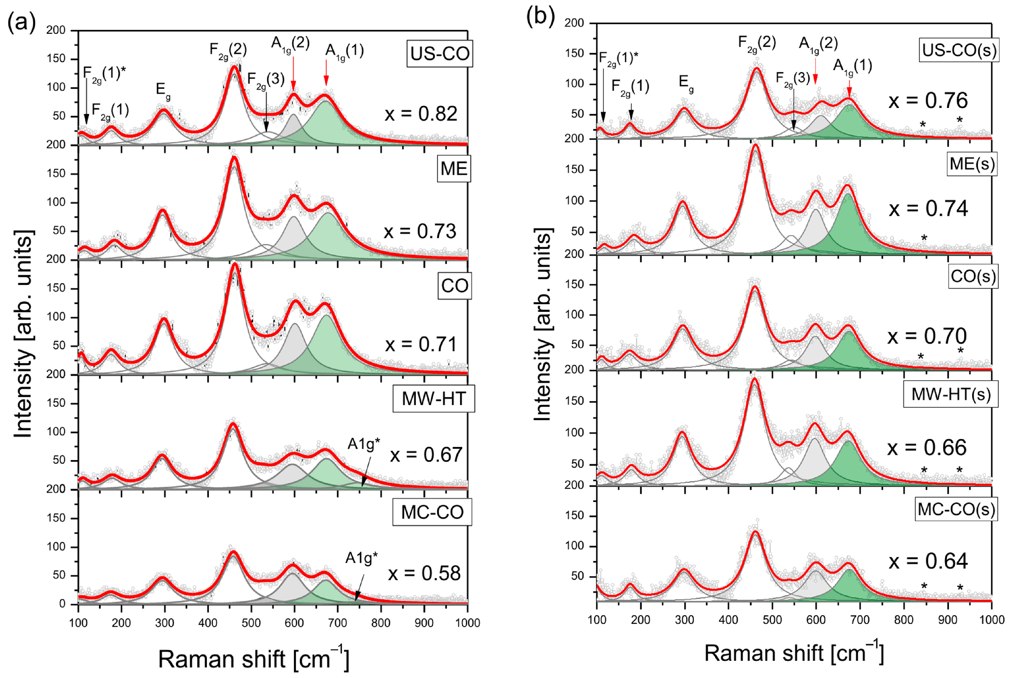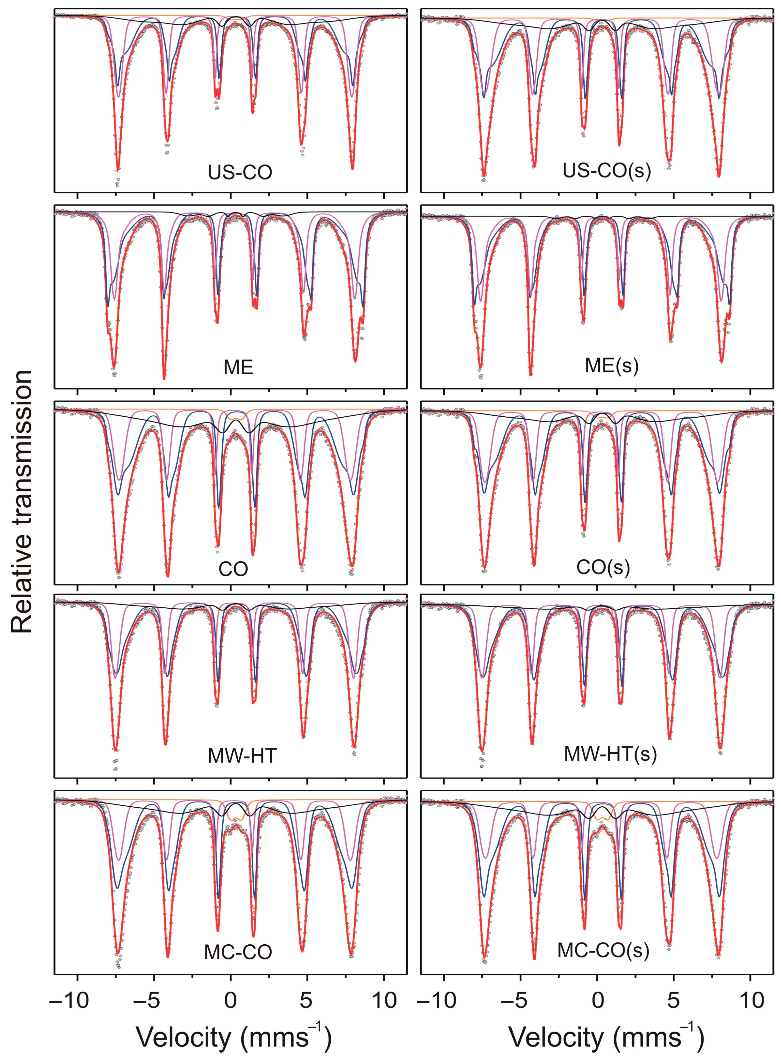 The CO and MW-HT samples exhibit the largest deviations between the degrees of inversion determined by Mössbauer analysis (xMoss) and those obtained from XRD analysis (xXRD). For the other samples, the differences are smaller. As mentioned above, the sextet overlap prevents a more accurate determination of the inversion coefficient.