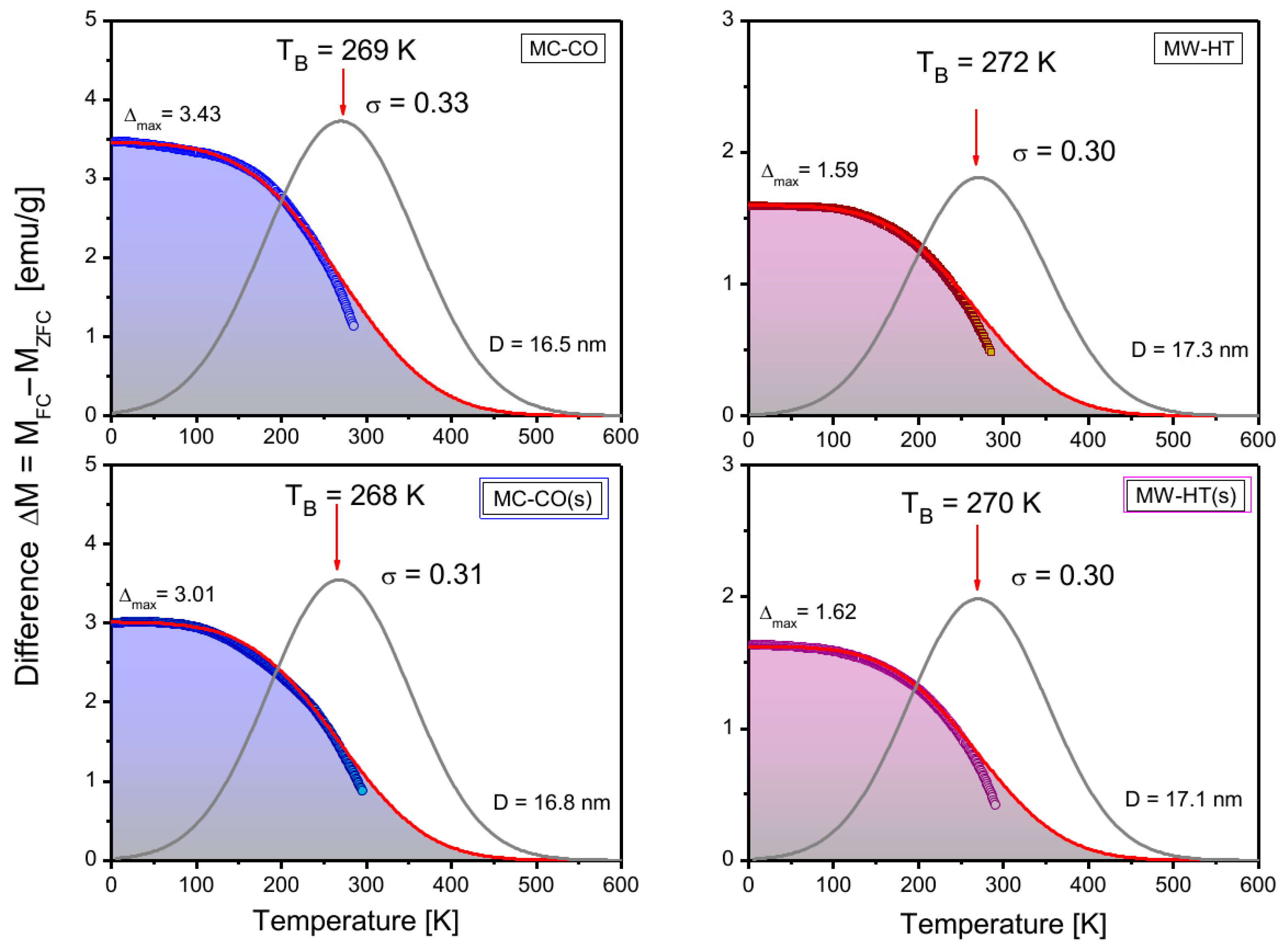 max in MC-CO(s) coincides with the increase of nanoparticle size. For the MW-HT(s) sample, with greater nanoparticles and an unchanged narrow size distribution, the changes in Δ