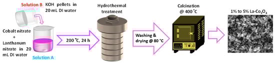 Lanthanum-doped Co3O4 nanoparticles were synthesized via a hydrothermal method, as illustrated in Figure 1. Solution A was prepared by dissolving 1 mol L−1 Co(NO3)2·6H2O in 20 mL of DI water under constant stirring. Lanthanum nitrate was added in molar ratios of 1%, 3%, and 5% with respect to Co2+ ions, and the solution was until complete dissolution. Separately, solution B was prepared by dissolving 1 mol L−1 KOH in 20 mL of DI water. The solution was subsequently added drop wise to solution A while continuously stirring to achieve a homogenous mixture, with the pH of the combined solution maintained at 9 to ensure regulated nucleation and development of the nanoparticles. The resulting solution was transferred into a 100 mL Teflon-lined stainless-steel autoclave and heated at 200 °C for 24 h. After cooling to room temperature. The precipitated was collected, washed four times with ethanol and deionized water in order to remove impurities, and afterwards dried at 80 °C for 12 h. The dried powder was then calcinated at 400 °C for 4 h, utilizing a controlled heating rate of 3 °C min−1. The final products were labeled as 1%, 3%, and 5% La-Co3O4, reflecting the different lanthanum contents.