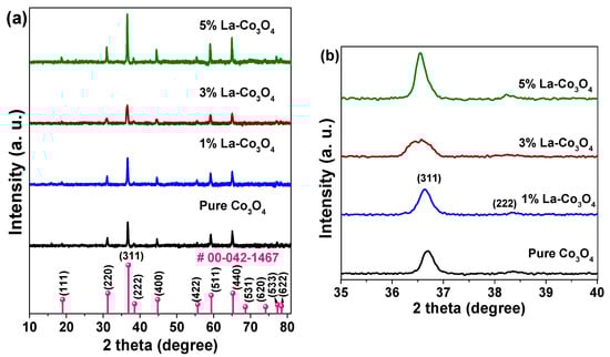 (a) XRD spectra of pure and La (1–5%) doped Co3O4 nanocubes recorded using a CuKα X-ray source. (b) Expanded view of (311) and (222) diffraction planes.