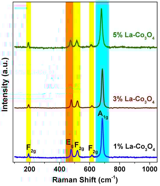 Raman spectra of La-doped (1–5%) Co3O4 nanocubes recorded with a 532 nm excitation laser (power of 50 mW).