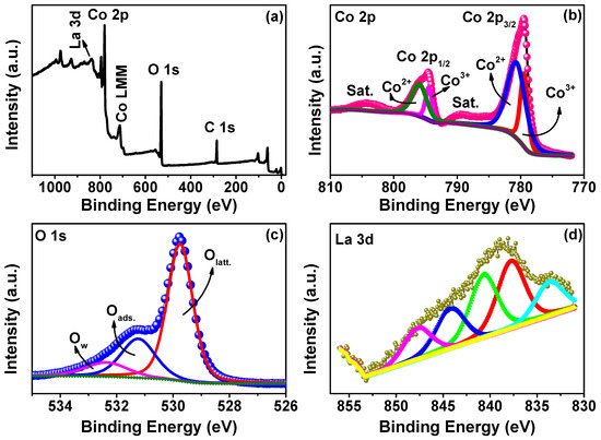 (a) XPS survey spectrum and high-resolution (b) Co 2p XPS spectrum, (c) O 1s XPS spectrum, and (d) La 3d XPS spectrum of the 1 mol% La-doped Co3O4 sample.