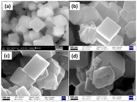 The surface morphology of La-doped Co3O4 samples was analyzed via field-emission scanning electron microscopy, as shown in Figure 5. All samples exhibit a well-defined cubic-like morphology, typical of spinel Co3O4 nanostructures. However, the La doping concentration significantly influences the uniformity and surface texture of the resulting particles. At a low doping level of 1 mol% La (Figure 5a), the particles appear as highly uniform nanocubes with smooth surfaces and sharply defined edges. This morphology suggests a high degree of crystallinity and minimal structural distortion, both of which are beneficial for enhanced electrochemical performance due to increased surface area and improved charge transport pathways. Increasing the La content to 3 mol% (Figure 5b) largely retains the cubic morphology, but noticeable surface roughness and particle aggregation begin to emerge.